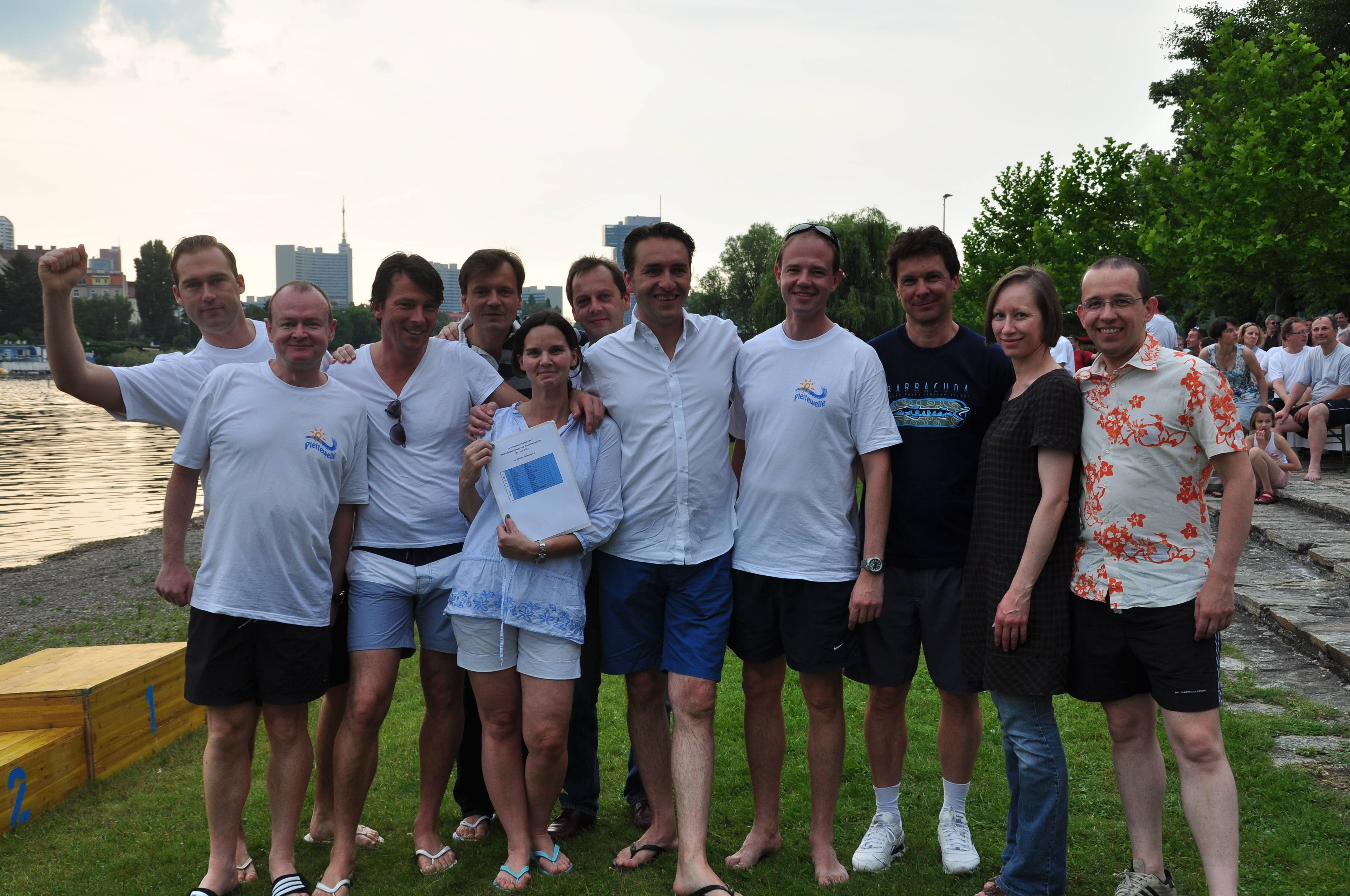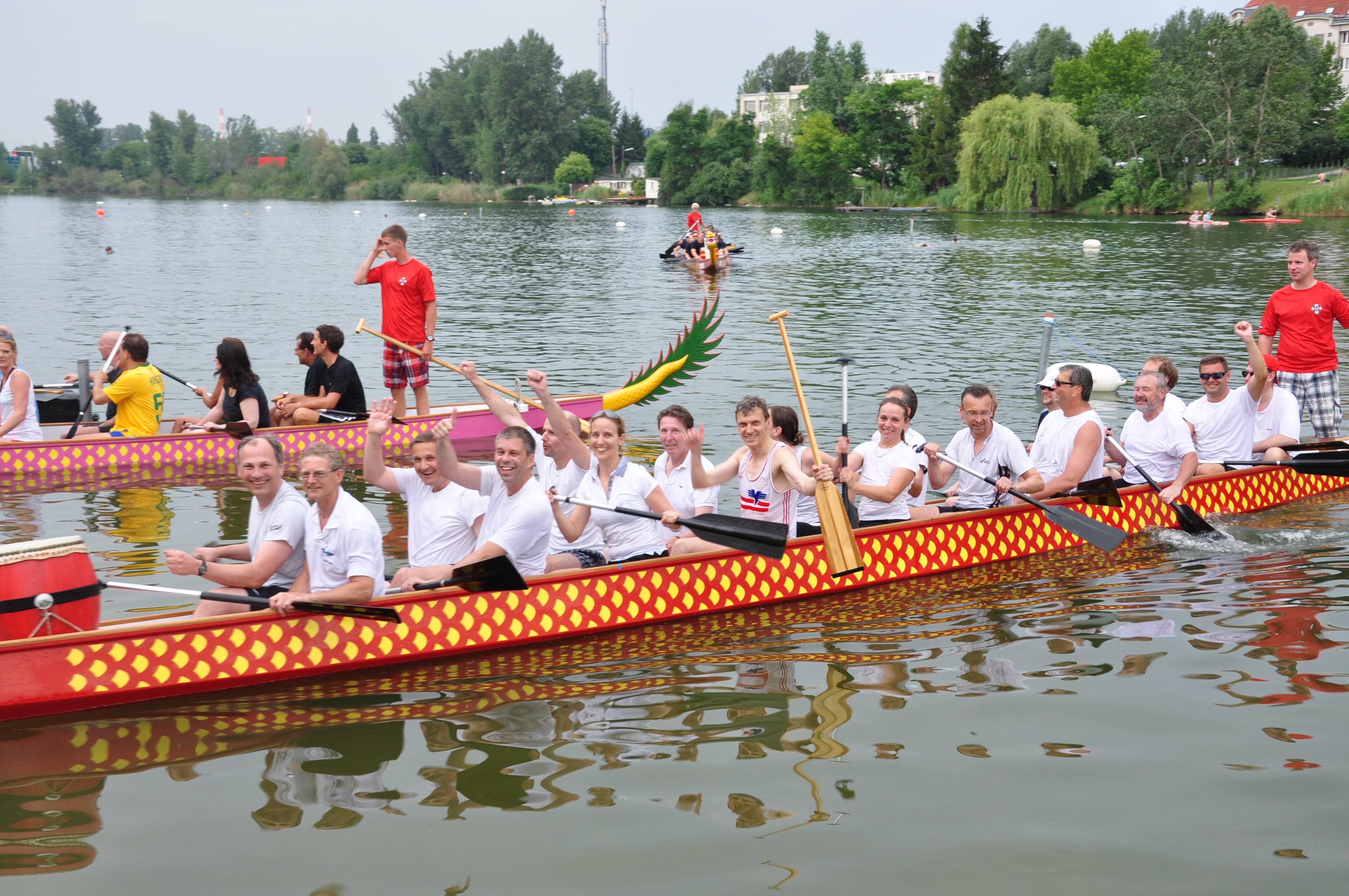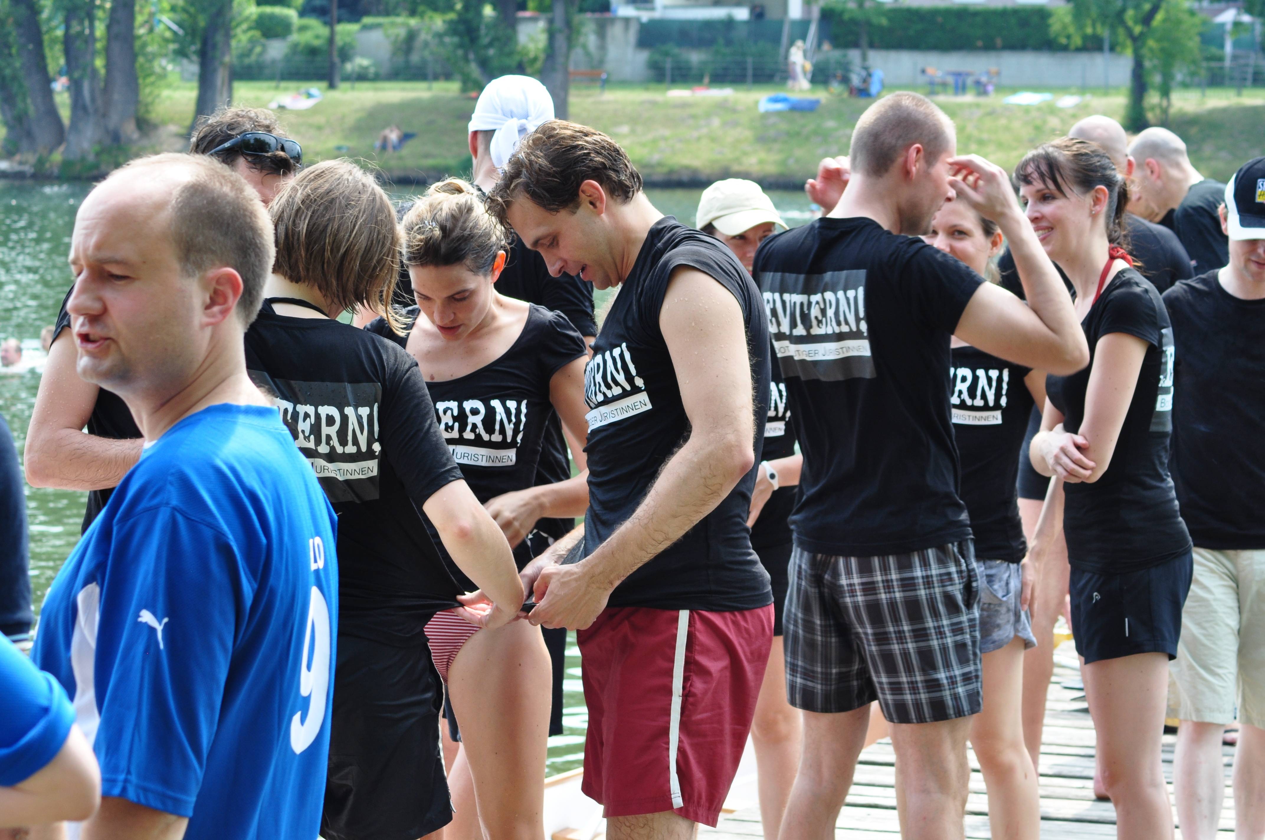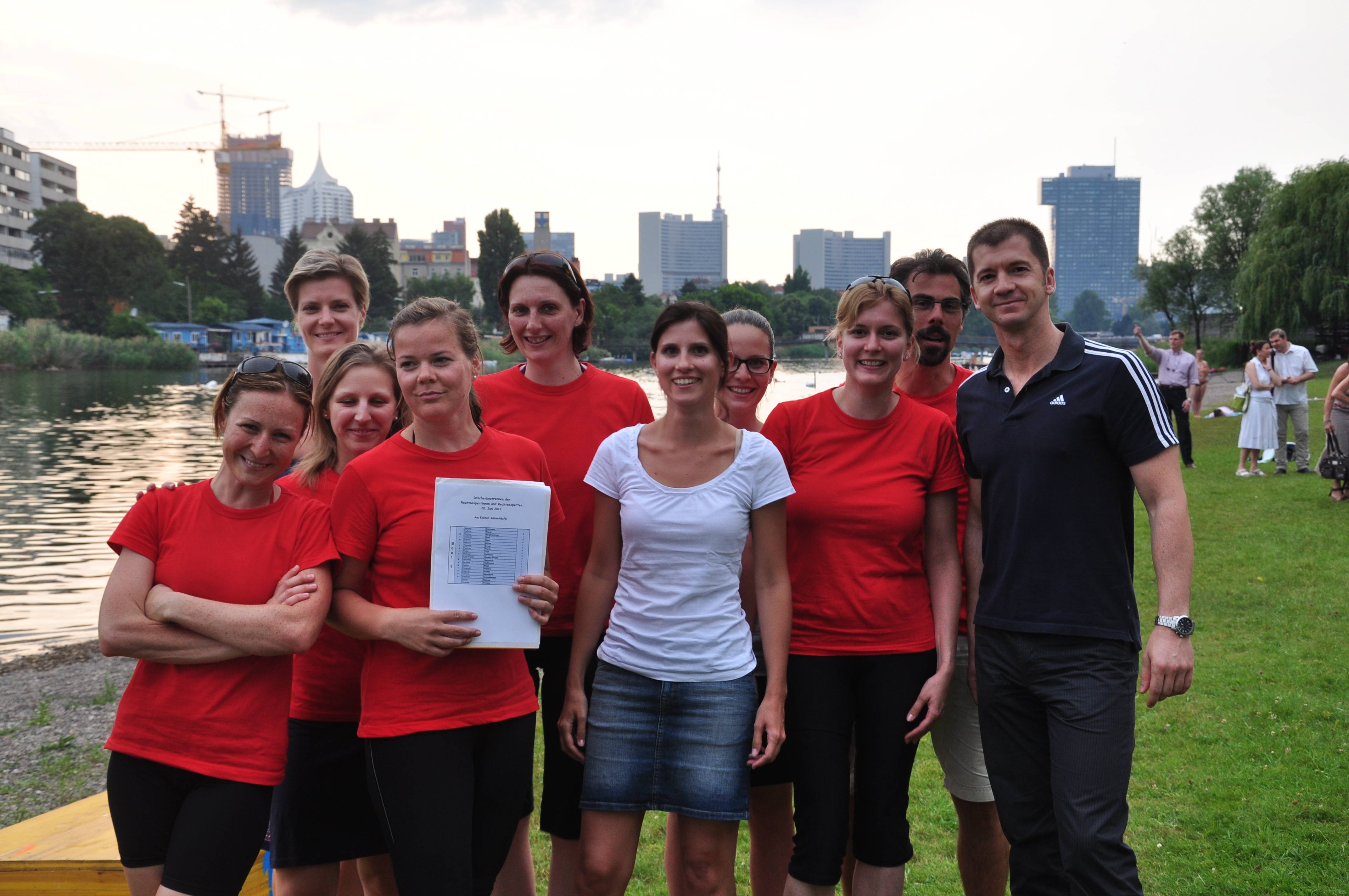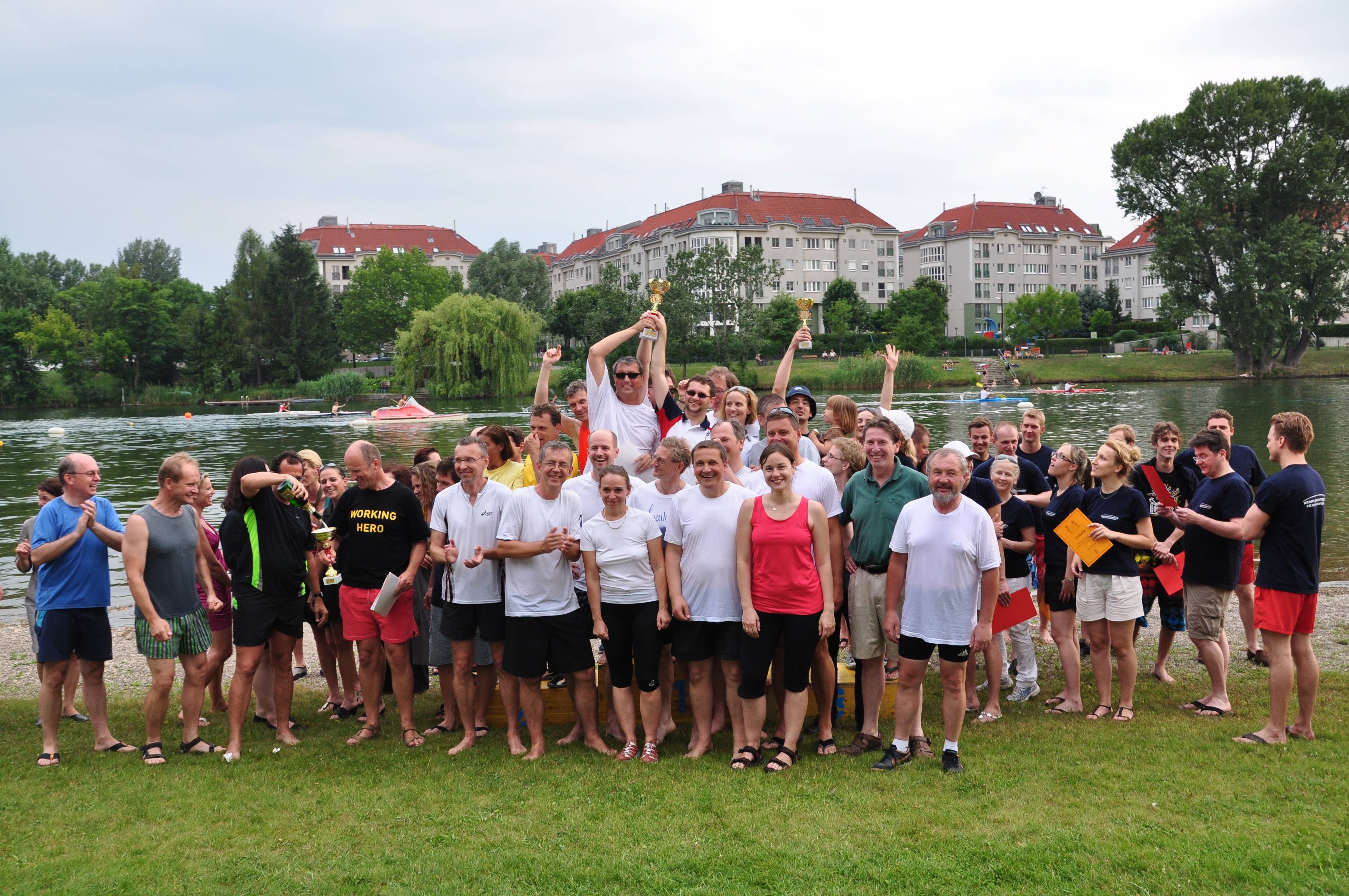 Die Finalisten des Drachenbootrennens am 20. Juni 2012 standen nach 9 Qualifikationsläufen fest. Den ersten Platz erreichte das Boot mit den Richterinnen und Richtern des Verwaltungsgerichtshofs. Sie nützten die Chance des „Hoffnungslaufs“, um sich für das Finale zu qualifizieren, bei dem vier Boote starteten, und waren dann als erste im Ziel – dicht gefolgt vom Boot der „Taktlosen“, besetzt mit Richterinnen und Richtern des Oberlandesgerichts Wien und des Landesgerichts für Strafsachen Wien! Sie hielten den Takt bis zum Schluss durch und hängten das Boot „Oberster Gerichtshof / Generalprokuratur / Evidenzbüro“ (4. Platz) sowie die Anwaltskanzlei Kraft & Winternitz (Vorjahressieger, heuer 3. Platz) ab.  Das Siegerboot - VwGH Am Rennen nahmen 18 Mannschaften teil; vertreten waren nicht nur jede Menge Justizboote (inkl. Bundesministerium für Justiz und Staatsanwaltschaft Wien) und ein Boot des Asylgerichtshofs, sondern auch einige Anwaltskanzleien und ein Boot voller Notare.  Im Finale: ein Kampf um jeden Wassertropfen  Glückliche „Silberne“ Im ersten Durchgang traten alle Mannschaften in Vierergruppen an, wobei es auf die erreichte Zeit ankam. Die drei Schnellsten (Kraft & Winternitz; OGH/Generalprokuratur/Evidenzbüro; OLG/LGSt) waren für das Finale qualifiziert. Die verbleibenden 16 Teams kämpften in der Zwischenrunde um den vierten Finalistenplatz, den sich der VwGH äußerst knapp vor dem Boot des BMJ sicherte. Im Finale hatten die Kolleginnen und Kollegen vom VwGH noch ausreichend Reserven, um einen unangefochtenen Sieg davonzupaddeln (was bewundernd – wenn auch widerwillig – anerkannt werden muss ...). Professionell organisiert hat das Rennen die Polizeisportvereinigung Wien, die nicht nur die Boote bereitstellte, sondern auch die Rennleitung übernahm und die Zeitnehmung mit einer Zielkamera jedem Zweifel entzog – vielen Dank!  Hochspannung unter den Zuschauern Besonderer Dank gilt auch der GÖD für das Sponsoring sowie der Sektion Wien der Vereinigung der österreichischen Richterinnen und Richter, die dieses sportliche Großereignis (knapp 400 Athletinnen und Athleten!) und das nachfolgende Sommerfest organisierte – vor allem in Person von Martina Erlebach und Sabine Matejka!