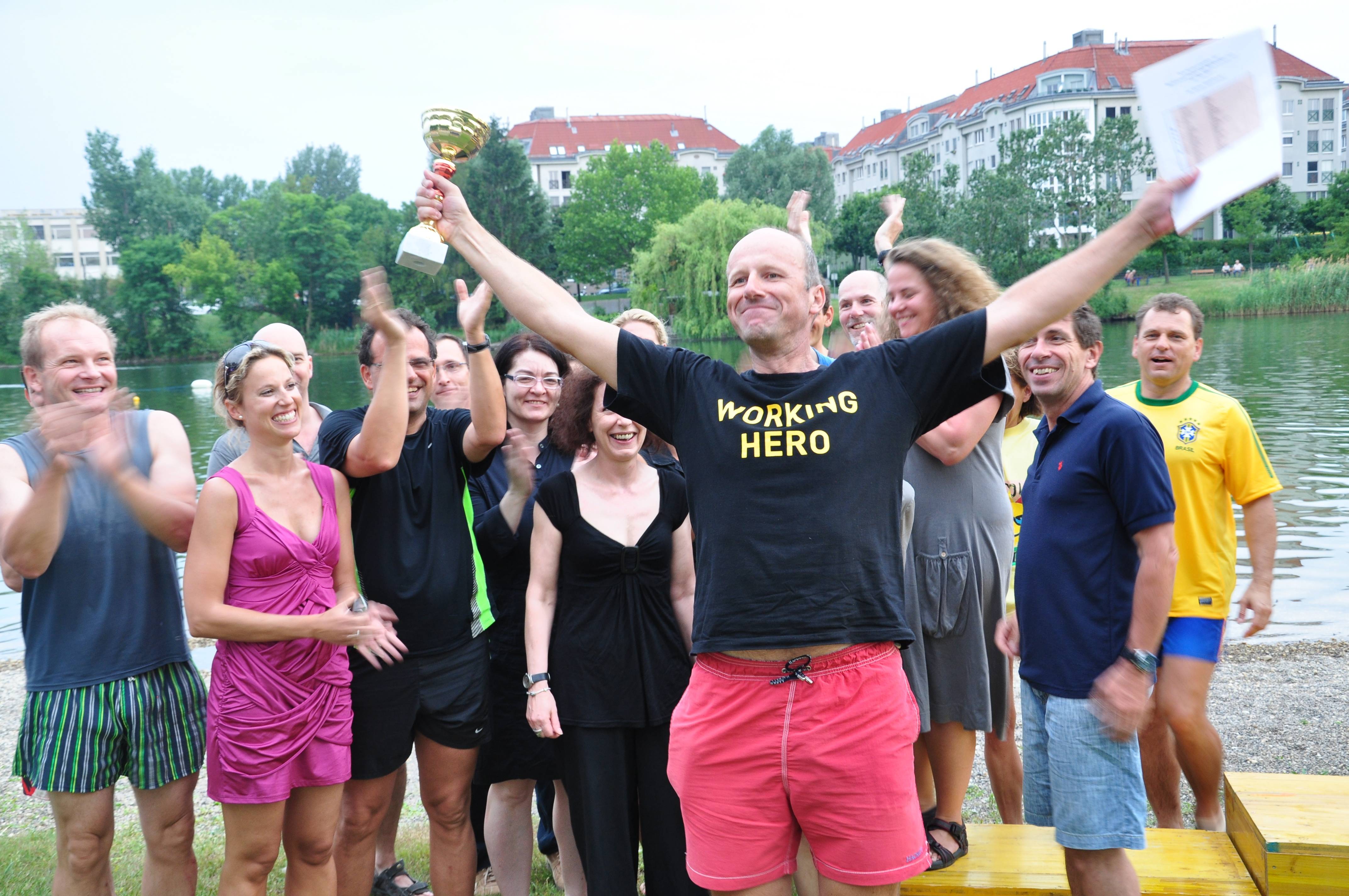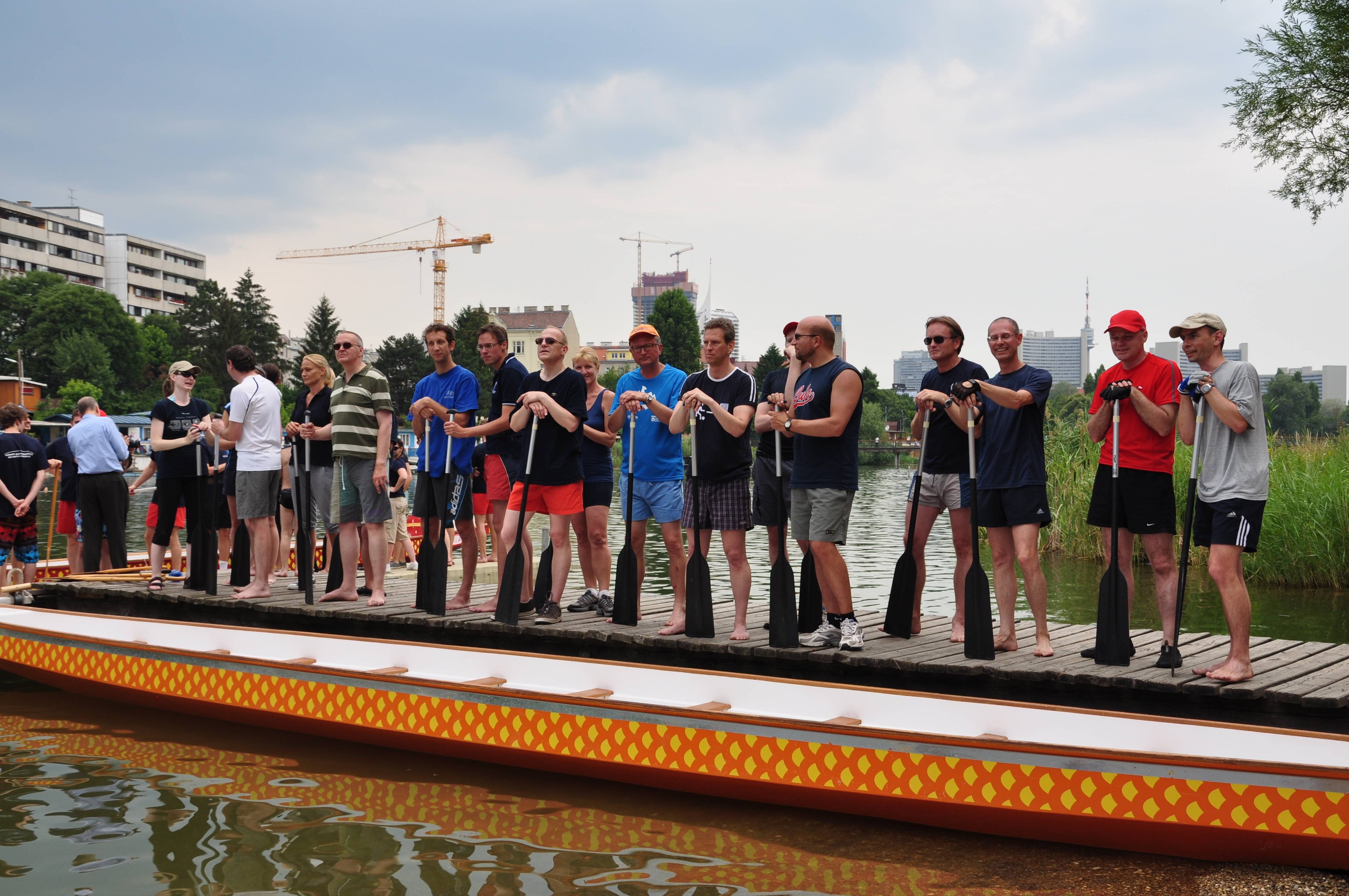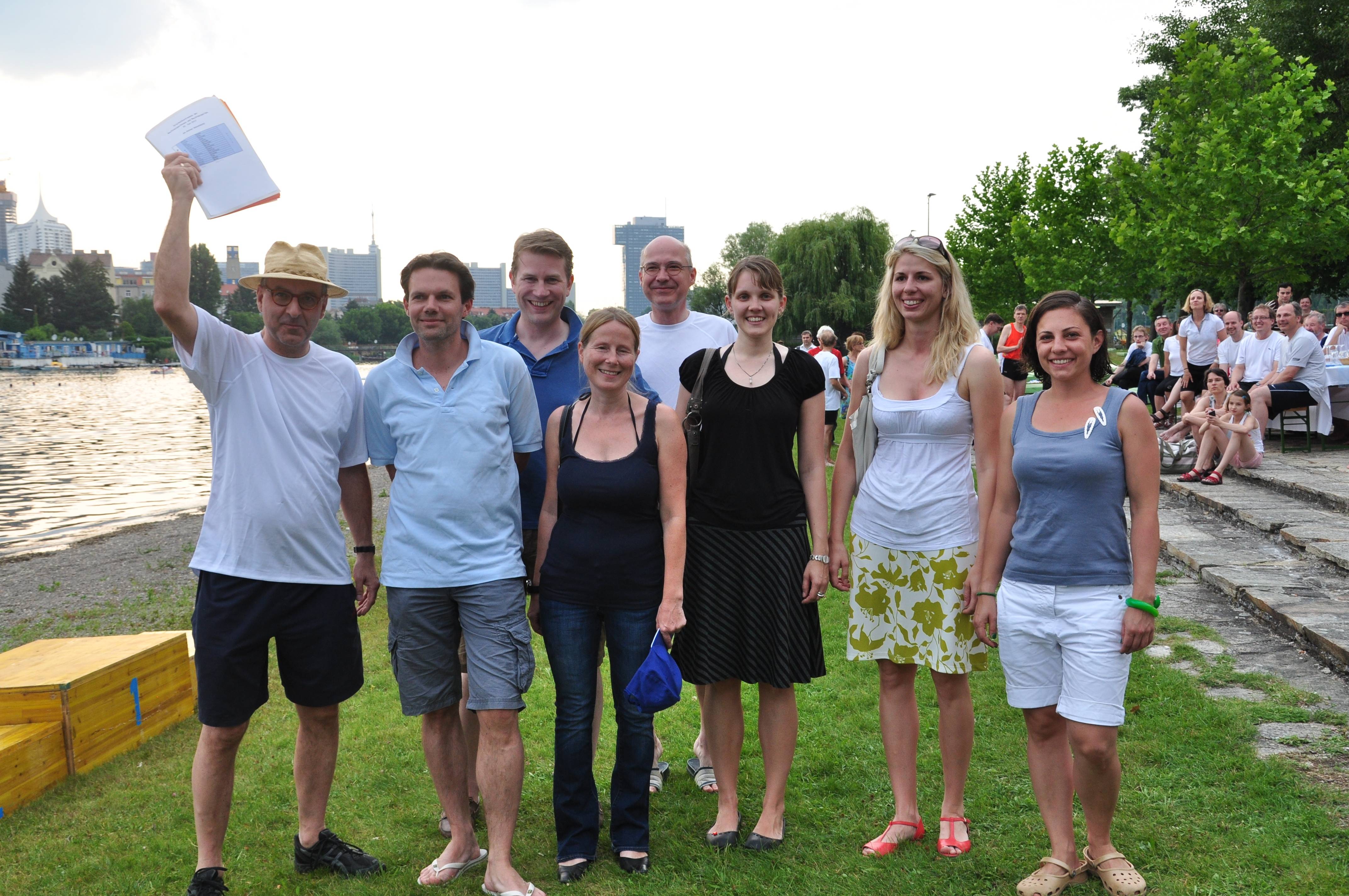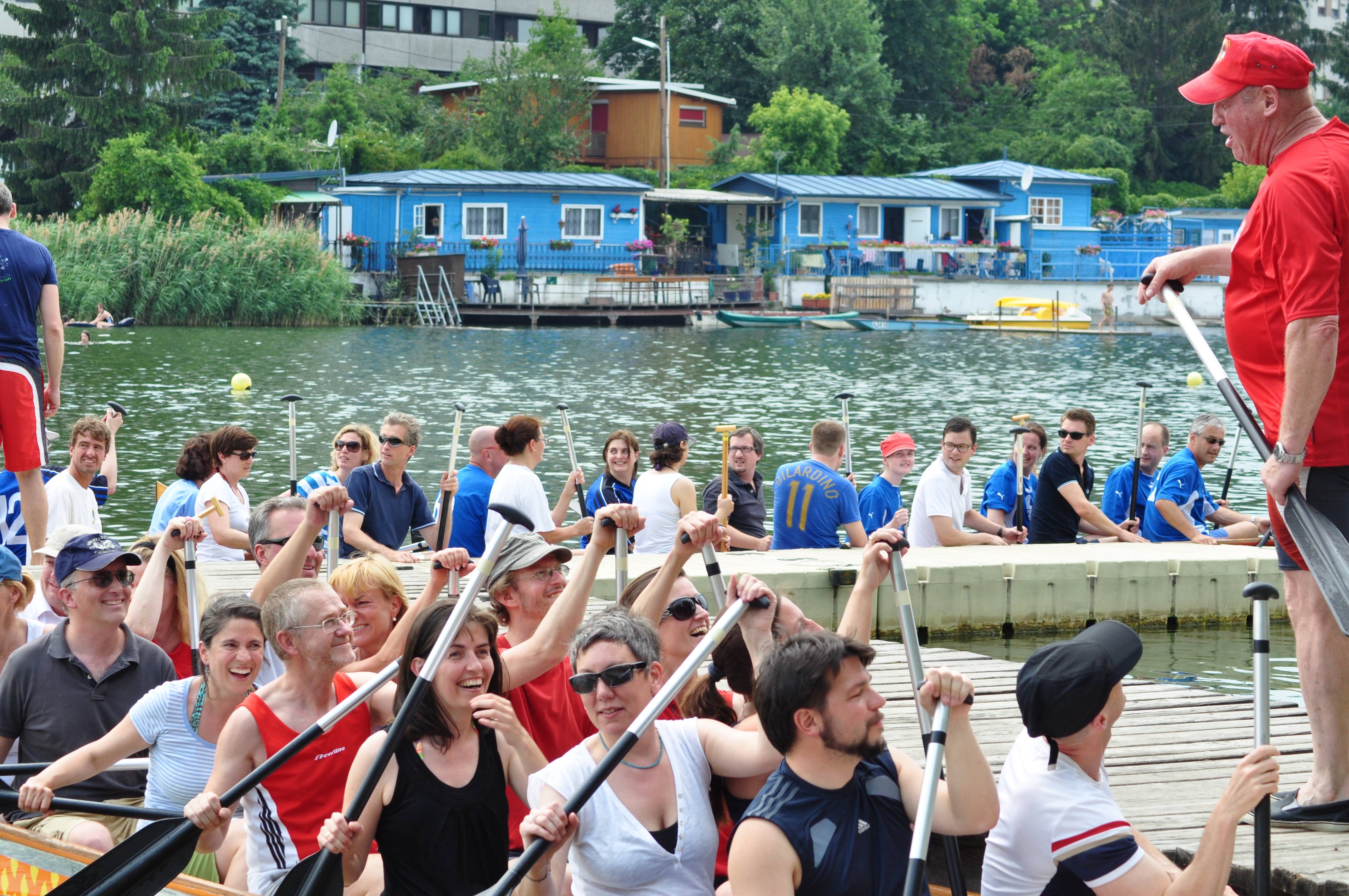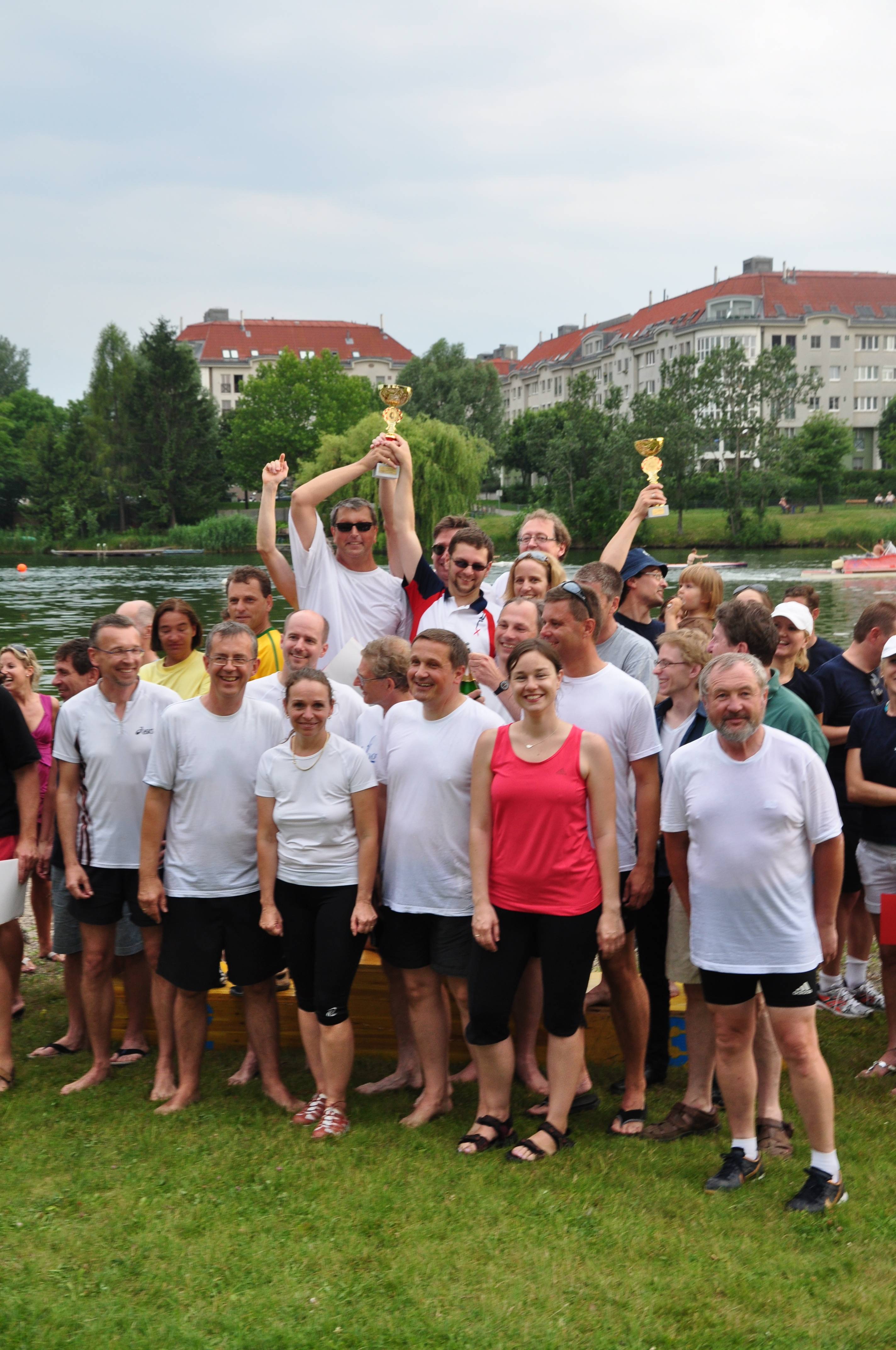 Die Finalisten des Drachenbootrennens am 20. Juni 2012 standen nach 9 Qualifikationsläufen fest. Den ersten Platz erreichte das Boot mit den Richterinnen und Richtern des Verwaltungsgerichtshofs. Sie nützten die Chance des „Hoffnungslaufs“, um sich für das Finale zu qualifizieren, bei dem vier Boote starteten, und waren dann als erste im Ziel – dicht gefolgt vom Boot der „Taktlosen“, besetzt mit Richterinnen und Richtern des Oberlandesgerichts Wien und des Landesgerichts für Strafsachen Wien! Sie hielten den Takt bis zum Schluss durch und hängten das Boot „Oberster Gerichtshof / Generalprokuratur / Evidenzbüro“ (4. Platz) sowie die Anwaltskanzlei Kraft & Winternitz (Vorjahressieger, heuer 3. Platz) ab.  Das Siegerboot - VwGH Am Rennen nahmen 18 Mannschaften teil; vertreten waren nicht nur jede Menge Justizboote (inkl. Bundesministerium für Justiz und Staatsanwaltschaft Wien) und ein Boot des Asylgerichtshofs, sondern auch einige Anwaltskanzleien und ein Boot voller Notare.  Im Finale: ein Kampf um jeden Wassertropfen  Glückliche „Silberne“ Im ersten Durchgang traten alle Mannschaften in Vierergruppen an, wobei es auf die erreichte Zeit ankam. Die drei Schnellsten (Kraft & Winternitz; OGH/Generalprokuratur/Evidenzbüro; OLG/LGSt) waren für das Finale qualifiziert. Die verbleibenden 16 Teams kämpften in der Zwischenrunde um den vierten Finalistenplatz, den sich der VwGH äußerst knapp vor dem Boot des BMJ sicherte. Im Finale hatten die Kolleginnen und Kollegen vom VwGH noch ausreichend Reserven, um einen unangefochtenen Sieg davonzupaddeln (was bewundernd – wenn auch widerwillig – anerkannt werden muss ...). Professionell organisiert hat das Rennen die Polizeisportvereinigung Wien, die nicht nur die Boote bereitstellte, sondern auch die Rennleitung übernahm und die Zeitnehmung mit einer Zielkamera jedem Zweifel entzog – vielen Dank!  Hochspannung unter den Zuschauern Besonderer Dank gilt auch der GÖD für das Sponsoring sowie der Sektion Wien der Vereinigung der österreichischen Richterinnen und Richter, die dieses sportliche Großereignis (knapp 400 Athletinnen und Athleten!) und das nachfolgende Sommerfest organisierte – vor allem in Person von Martina Erlebach und Sabine Matejka!