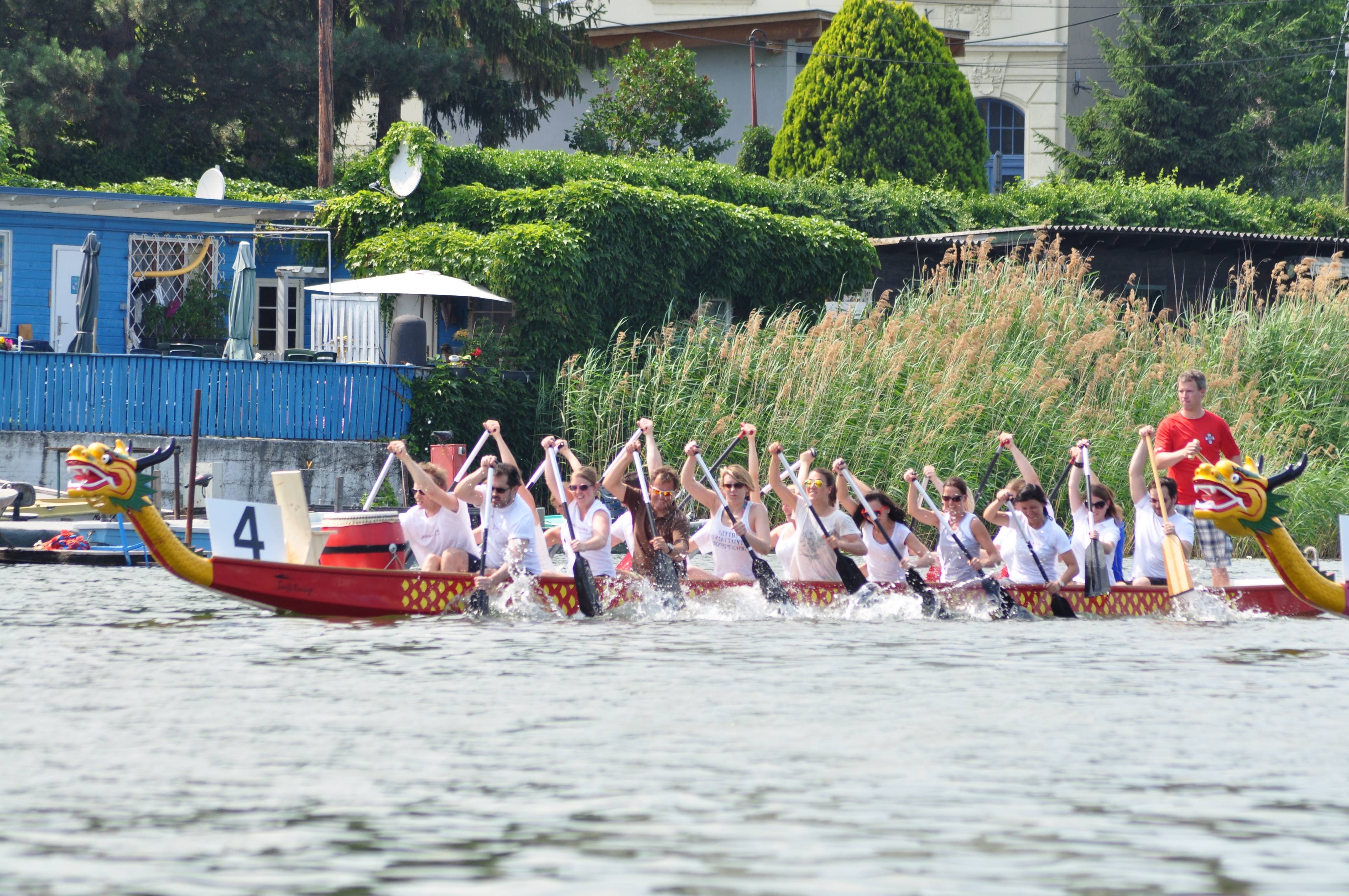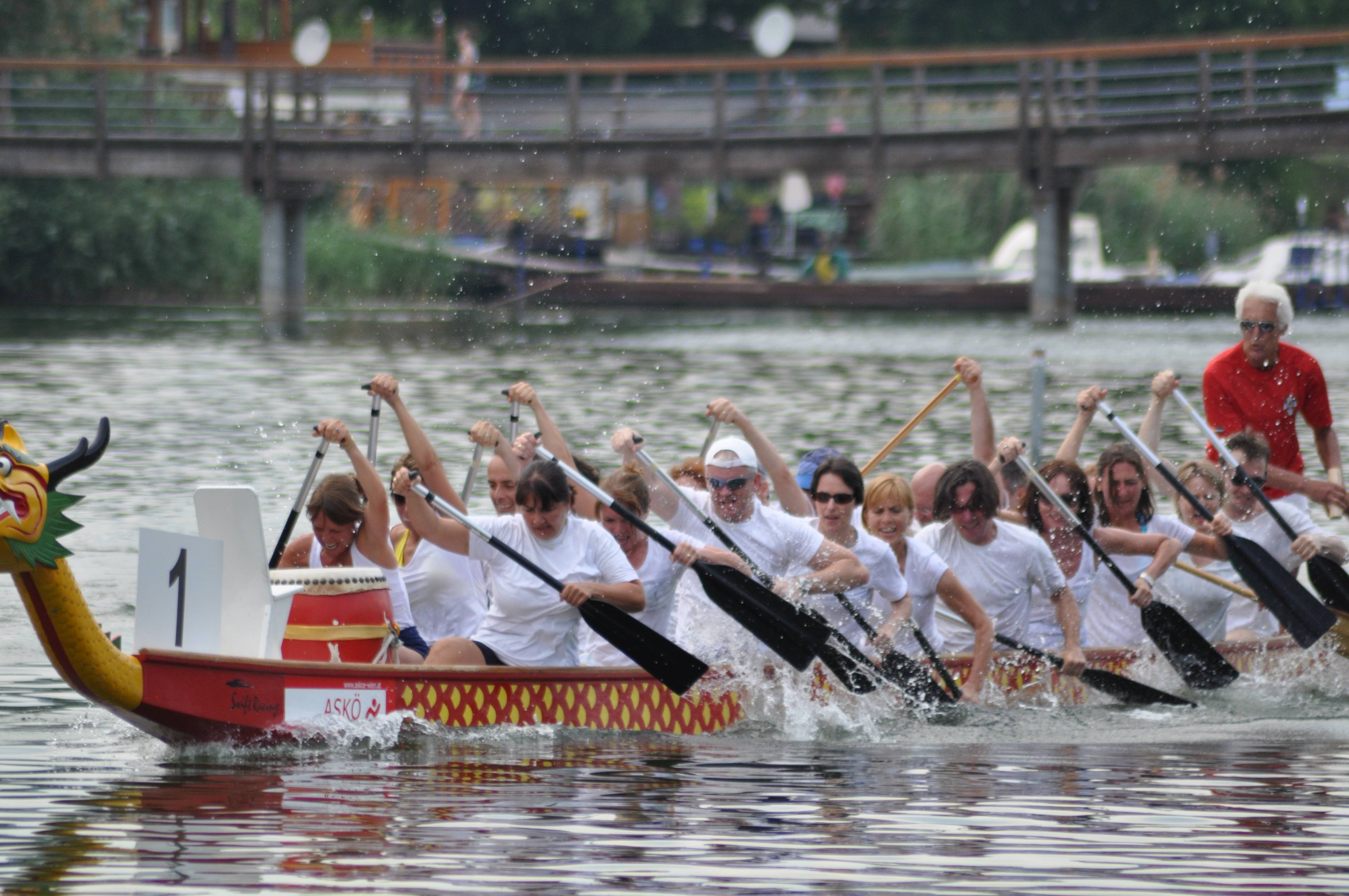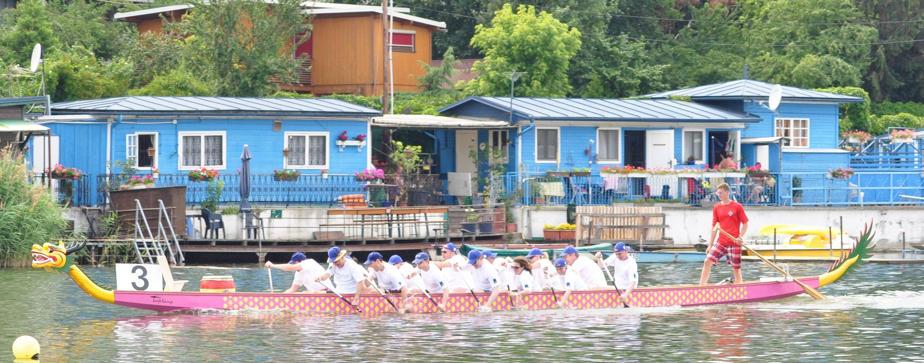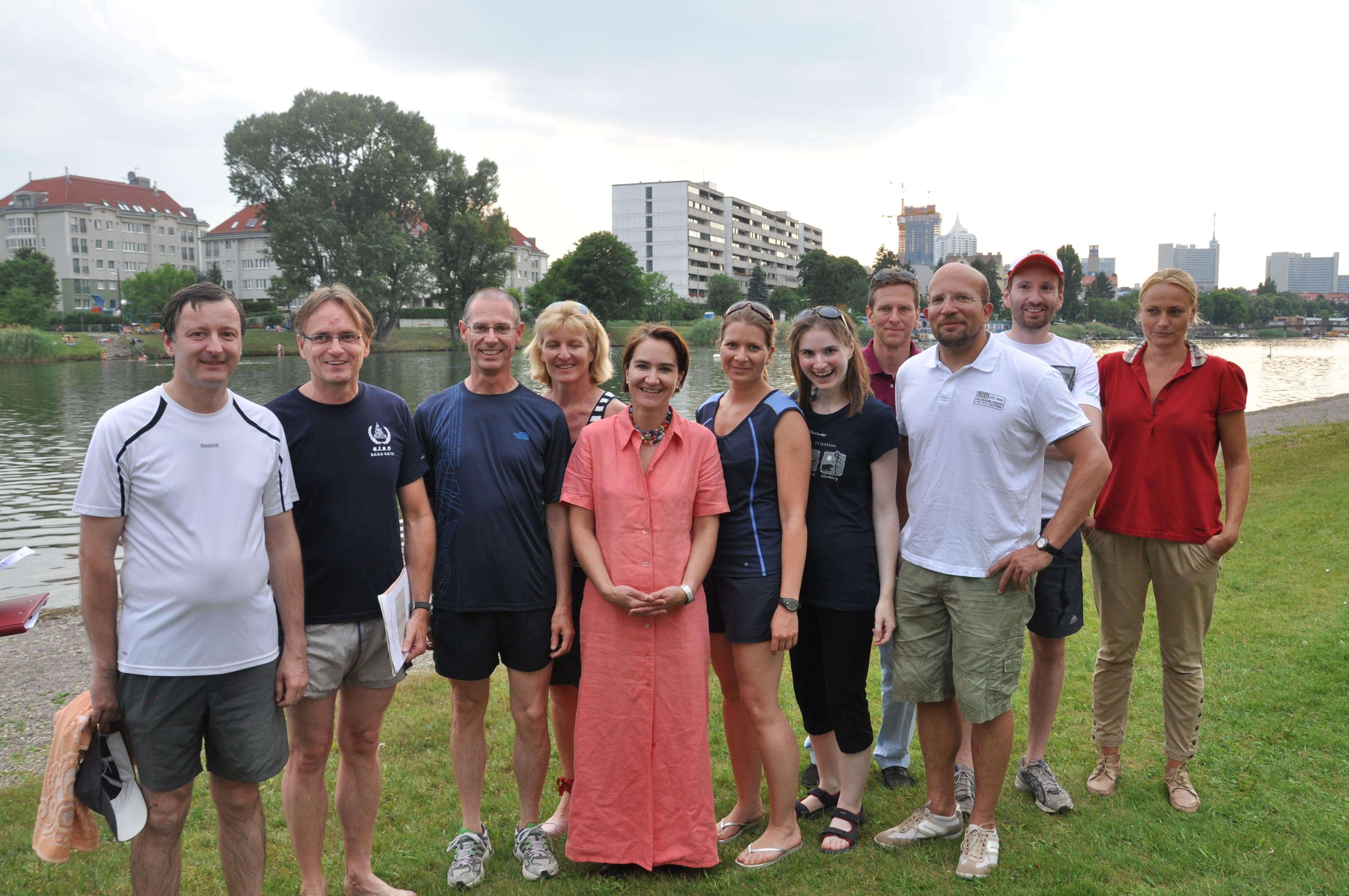 Die Finalisten des Drachenbootrennens am 20. Juni 2012 standen nach 9 Qualifikationsläufen fest. Den ersten Platz erreichte das Boot mit den Richterinnen und Richtern des Verwaltungsgerichtshofs. Sie nützten die Chance des „Hoffnungslaufs“, um sich für das Finale zu qualifizieren, bei dem vier Boote starteten, und waren dann als erste im Ziel – dicht gefolgt vom Boot der „Taktlosen“, besetzt mit Richterinnen und Richtern des Oberlandesgerichts Wien und des Landesgerichts für Strafsachen Wien! Sie hielten den Takt bis zum Schluss durch und hängten das Boot „Oberster Gerichtshof / Generalprokuratur / Evidenzbüro“ (4. Platz) sowie die Anwaltskanzlei Kraft & Winternitz (Vorjahressieger, heuer 3. Platz) ab.  Das Siegerboot - VwGH Am Rennen nahmen 18 Mannschaften teil; vertreten waren nicht nur jede Menge Justizboote (inkl. Bundesministerium für Justiz und Staatsanwaltschaft Wien) und ein Boot des Asylgerichtshofs, sondern auch einige Anwaltskanzleien und ein Boot voller Notare.  Im Finale: ein Kampf um jeden Wassertropfen  Glückliche „Silberne“ Im ersten Durchgang traten alle Mannschaften in Vierergruppen an, wobei es auf die erreichte Zeit ankam. Die drei Schnellsten (Kraft & Winternitz; OGH/Generalprokuratur/Evidenzbüro; OLG/LGSt) waren für das Finale qualifiziert. Die verbleibenden 16 Teams kämpften in der Zwischenrunde um den vierten Finalistenplatz, den sich der VwGH äußerst knapp vor dem Boot des BMJ sicherte. Im Finale hatten die Kolleginnen und Kollegen vom VwGH noch ausreichend Reserven, um einen unangefochtenen Sieg davonzupaddeln (was bewundernd – wenn auch widerwillig – anerkannt werden muss ...). Professionell organisiert hat das Rennen die Polizeisportvereinigung Wien, die nicht nur die Boote bereitstellte, sondern auch die Rennleitung übernahm und die Zeitnehmung mit einer Zielkamera jedem Zweifel entzog – vielen Dank!  Hochspannung unter den Zuschauern Besonderer Dank gilt auch der GÖD für das Sponsoring sowie der Sektion Wien der Vereinigung der österreichischen Richterinnen und Richter, die dieses sportliche Großereignis (knapp 400 Athletinnen und Athleten!) und das nachfolgende Sommerfest organisierte – vor allem in Person von Martina Erlebach und Sabine Matejka!