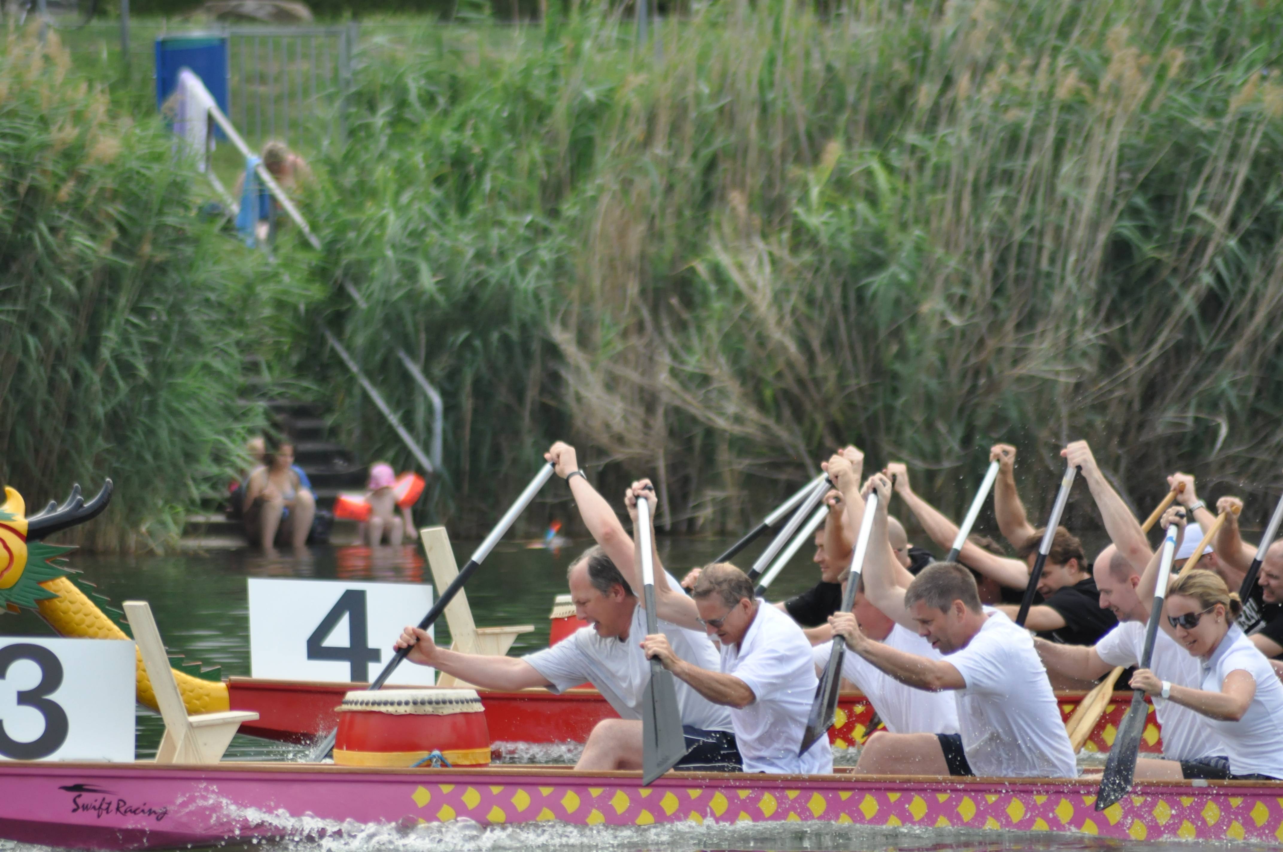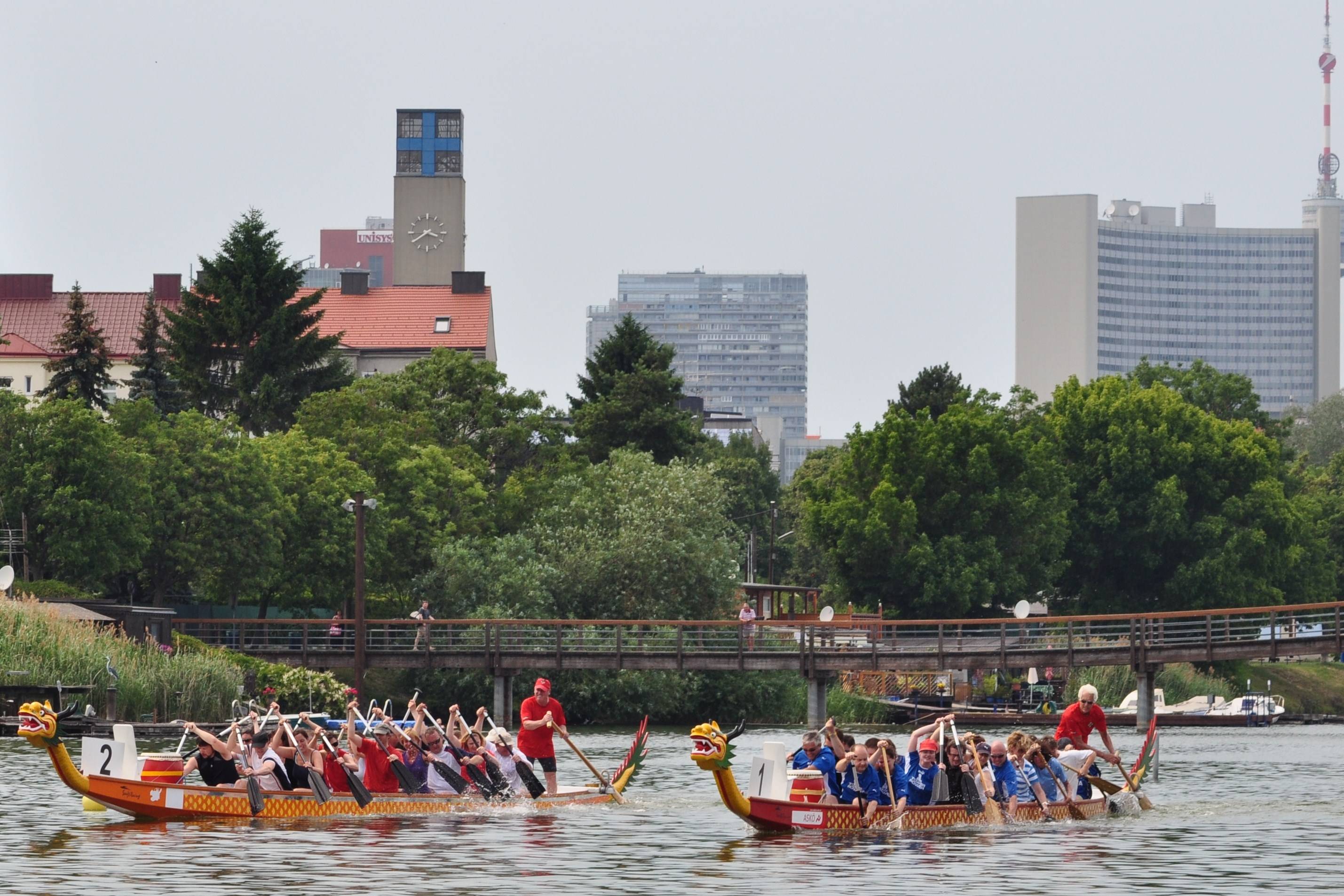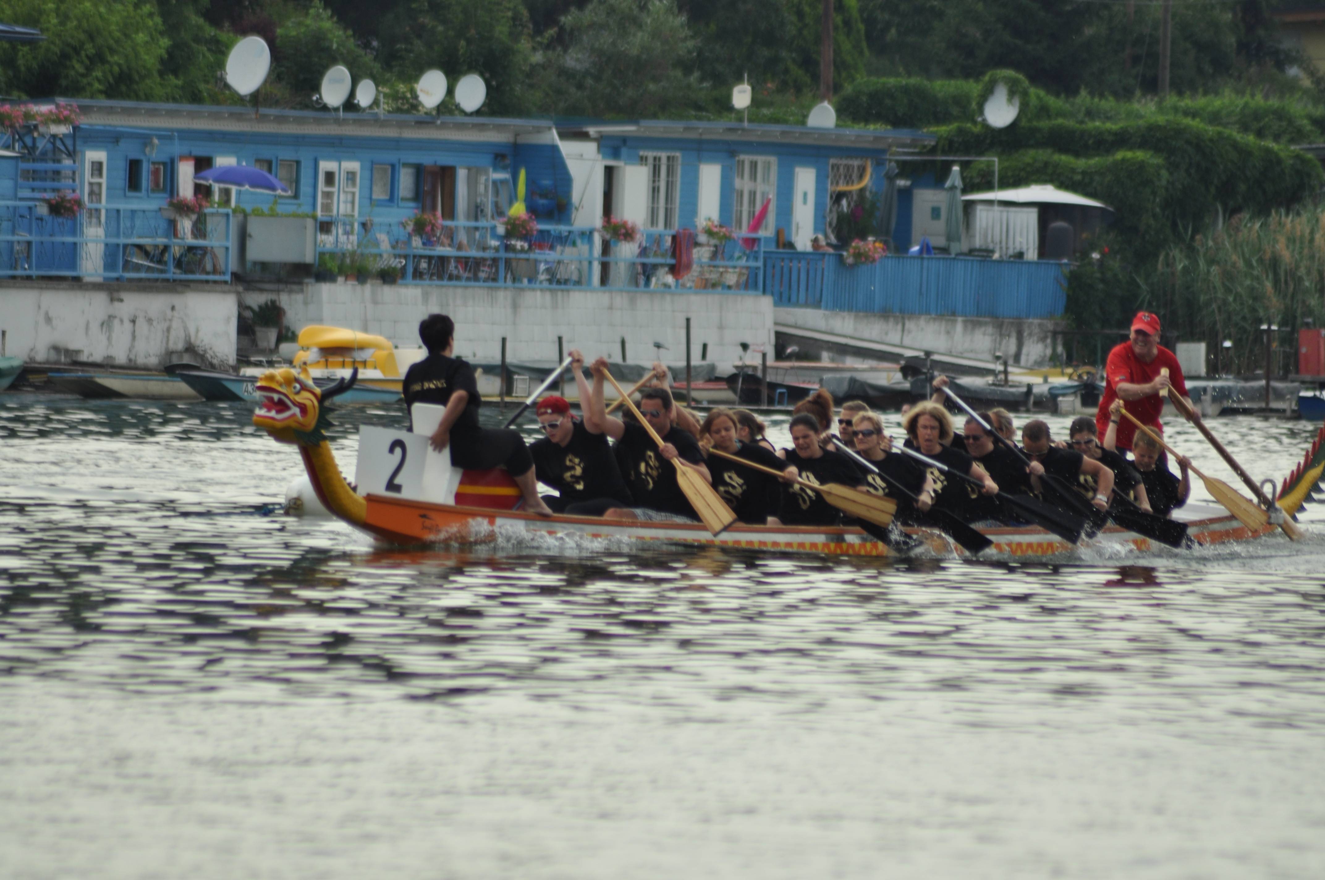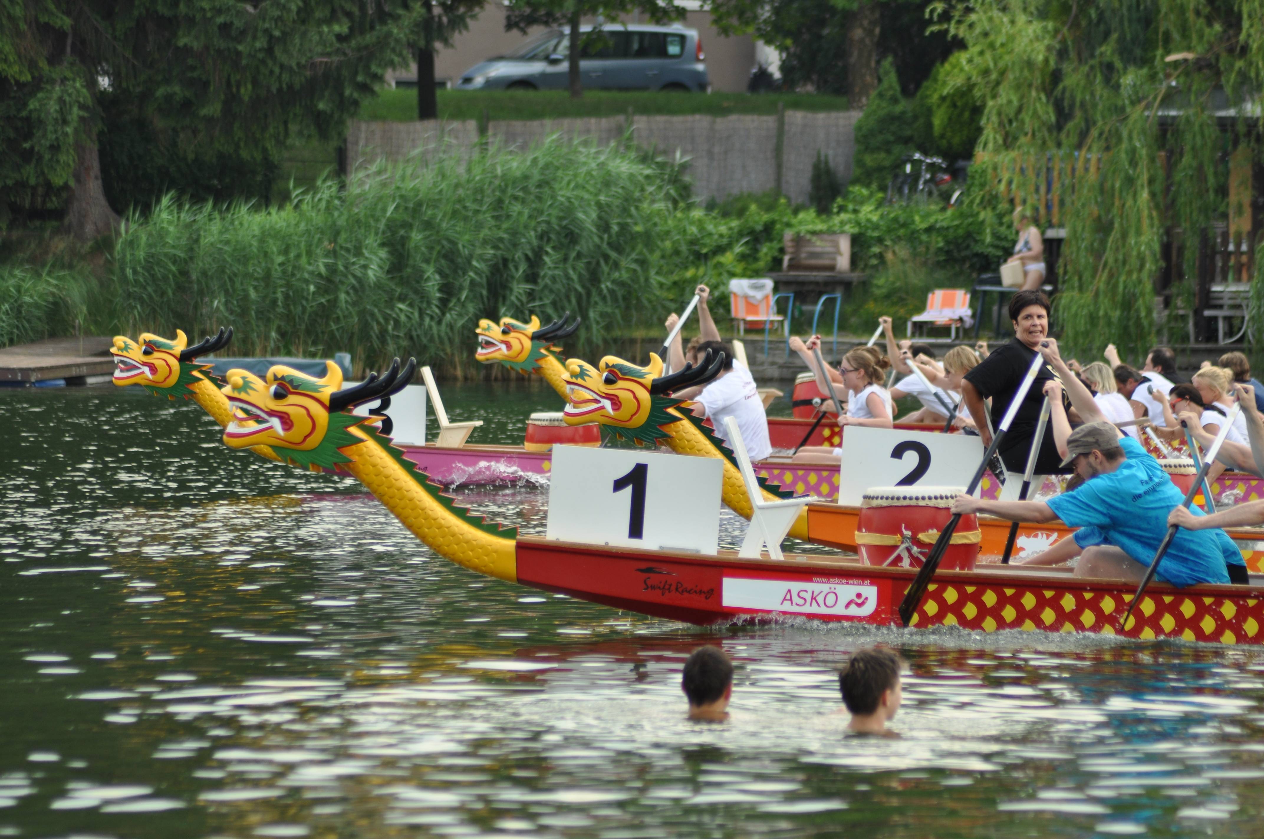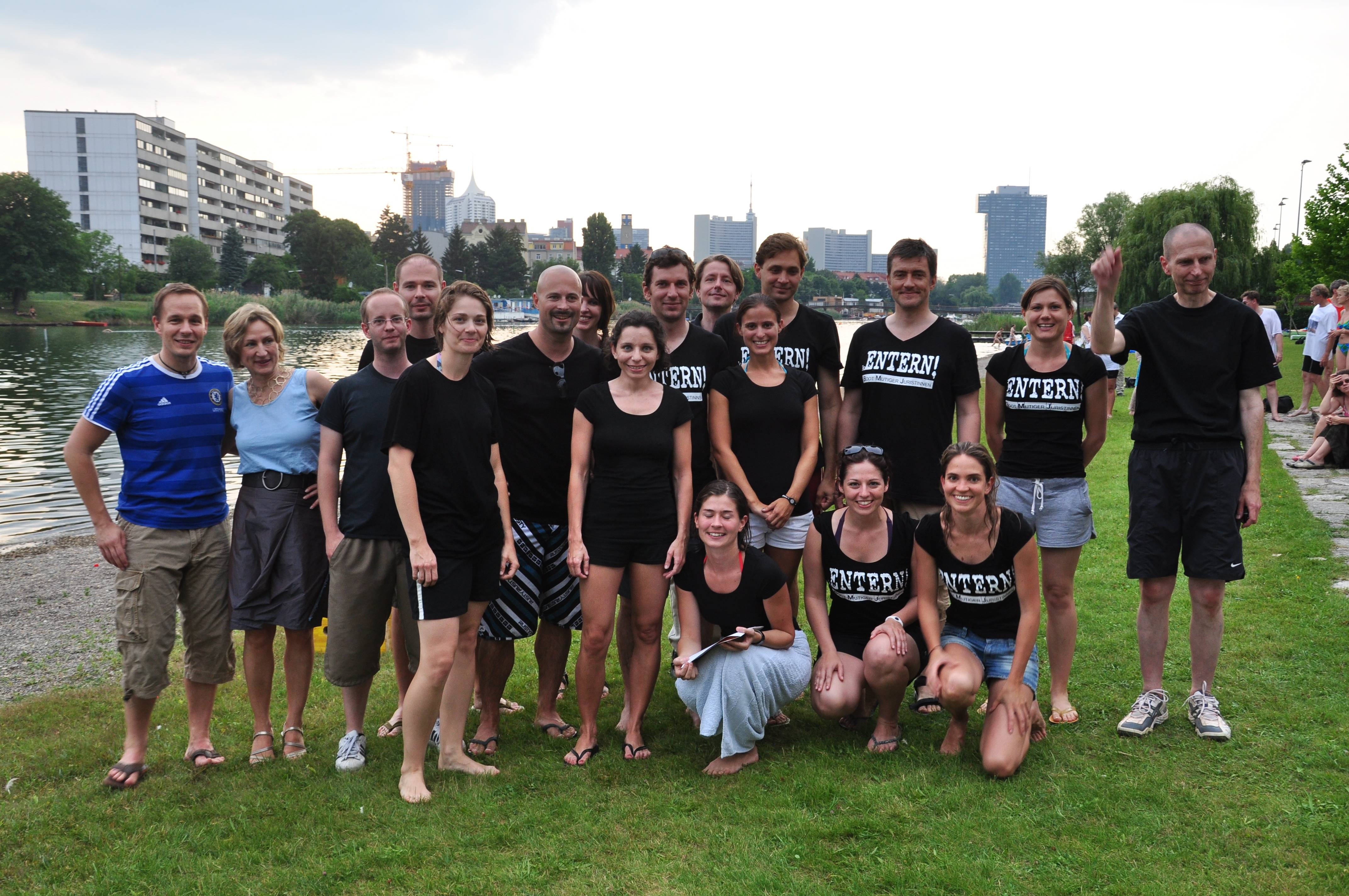 Die Finalisten des Drachenbootrennens am 20. Juni 2012 standen nach 9 Qualifikationsläufen fest. Den ersten Platz erreichte das Boot mit den Richterinnen und Richtern des Verwaltungsgerichtshofs. Sie nützten die Chance des „Hoffnungslaufs“, um sich für das Finale zu qualifizieren, bei dem vier Boote starteten, und waren dann als erste im Ziel – dicht gefolgt vom Boot der „Taktlosen“, besetzt mit Richterinnen und Richtern des Oberlandesgerichts Wien und des Landesgerichts für Strafsachen Wien! Sie hielten den Takt bis zum Schluss durch und hängten das Boot „Oberster Gerichtshof / Generalprokuratur / Evidenzbüro“ (4. Platz) sowie die Anwaltskanzlei Kraft & Winternitz (Vorjahressieger, heuer 3. Platz) ab.  Das Siegerboot - VwGH Am Rennen nahmen 18 Mannschaften teil; vertreten waren nicht nur jede Menge Justizboote (inkl. Bundesministerium für Justiz und Staatsanwaltschaft Wien) und ein Boot des Asylgerichtshofs, sondern auch einige Anwaltskanzleien und ein Boot voller Notare.  Im Finale: ein Kampf um jeden Wassertropfen  Glückliche „Silberne“ Im ersten Durchgang traten alle Mannschaften in Vierergruppen an, wobei es auf die erreichte Zeit ankam. Die drei Schnellsten (Kraft & Winternitz; OGH/Generalprokuratur/Evidenzbüro; OLG/LGSt) waren für das Finale qualifiziert. Die verbleibenden 16 Teams kämpften in der Zwischenrunde um den vierten Finalistenplatz, den sich der VwGH äußerst knapp vor dem Boot des BMJ sicherte. Im Finale hatten die Kolleginnen und Kollegen vom VwGH noch ausreichend Reserven, um einen unangefochtenen Sieg davonzupaddeln (was bewundernd – wenn auch widerwillig – anerkannt werden muss ...). Professionell organisiert hat das Rennen die Polizeisportvereinigung Wien, die nicht nur die Boote bereitstellte, sondern auch die Rennleitung übernahm und die Zeitnehmung mit einer Zielkamera jedem Zweifel entzog – vielen Dank!  Hochspannung unter den Zuschauern Besonderer Dank gilt auch der GÖD für das Sponsoring sowie der Sektion Wien der Vereinigung der österreichischen Richterinnen und Richter, die dieses sportliche Großereignis (knapp 400 Athletinnen und Athleten!) und das nachfolgende Sommerfest organisierte – vor allem in Person von Martina Erlebach und Sabine Matejka!