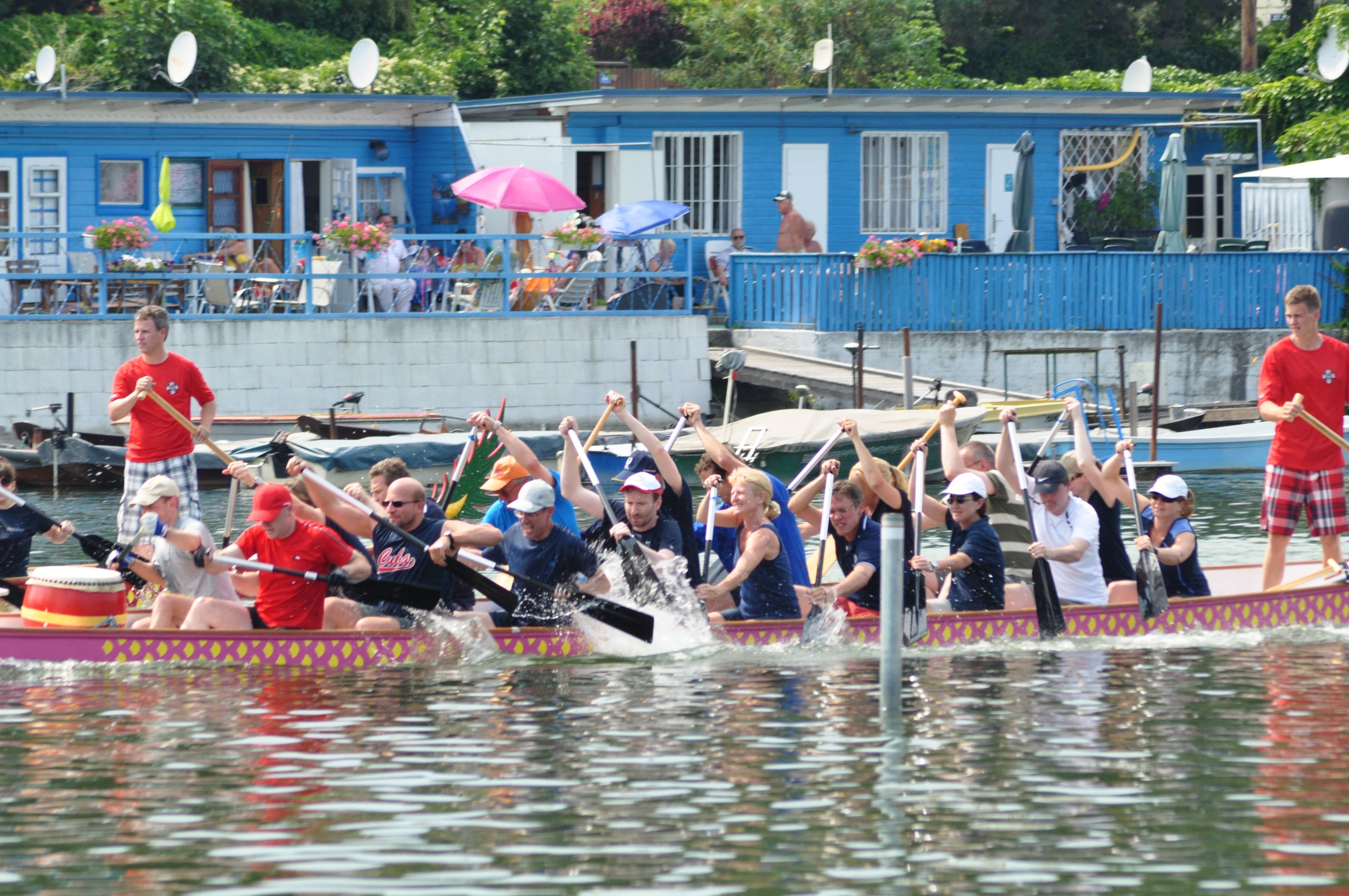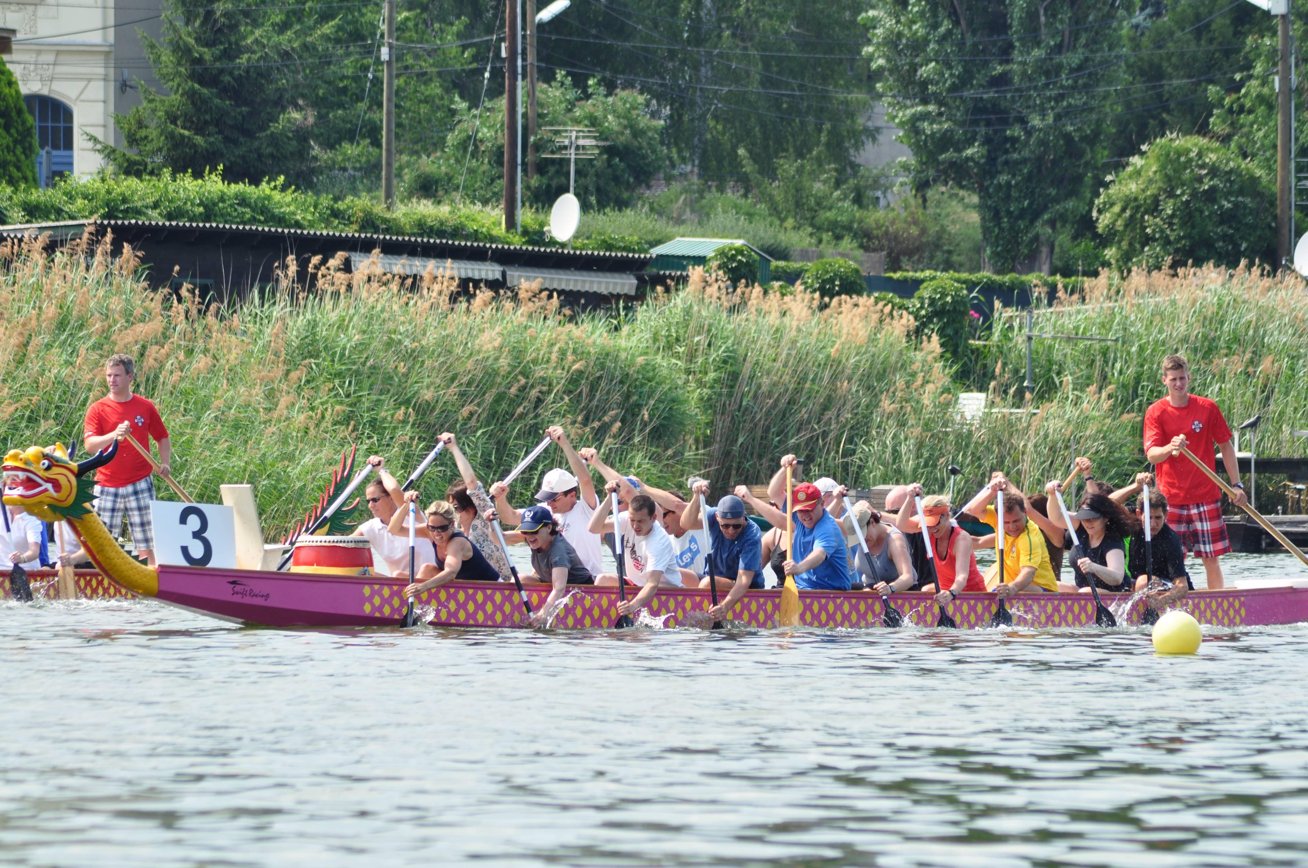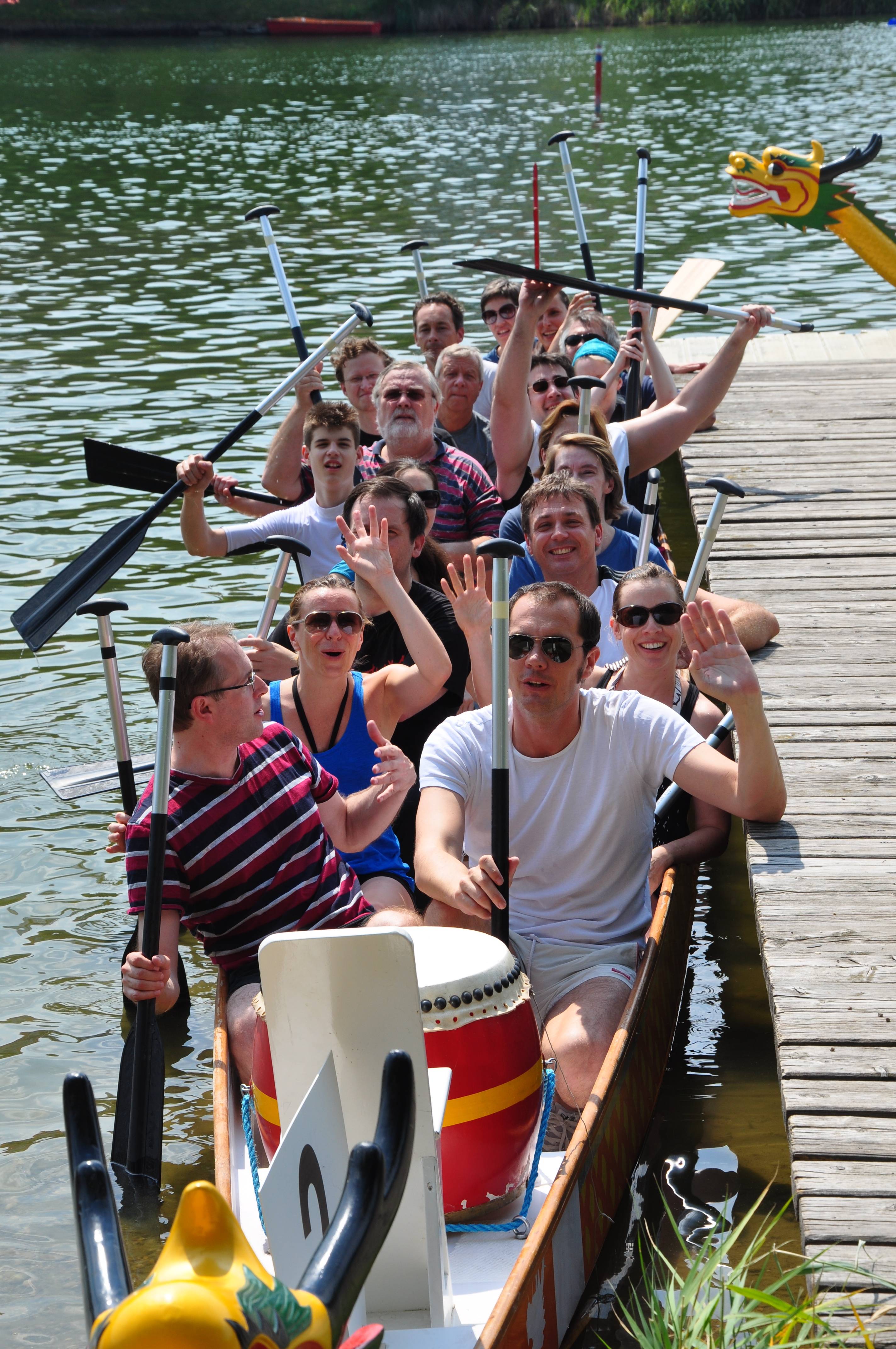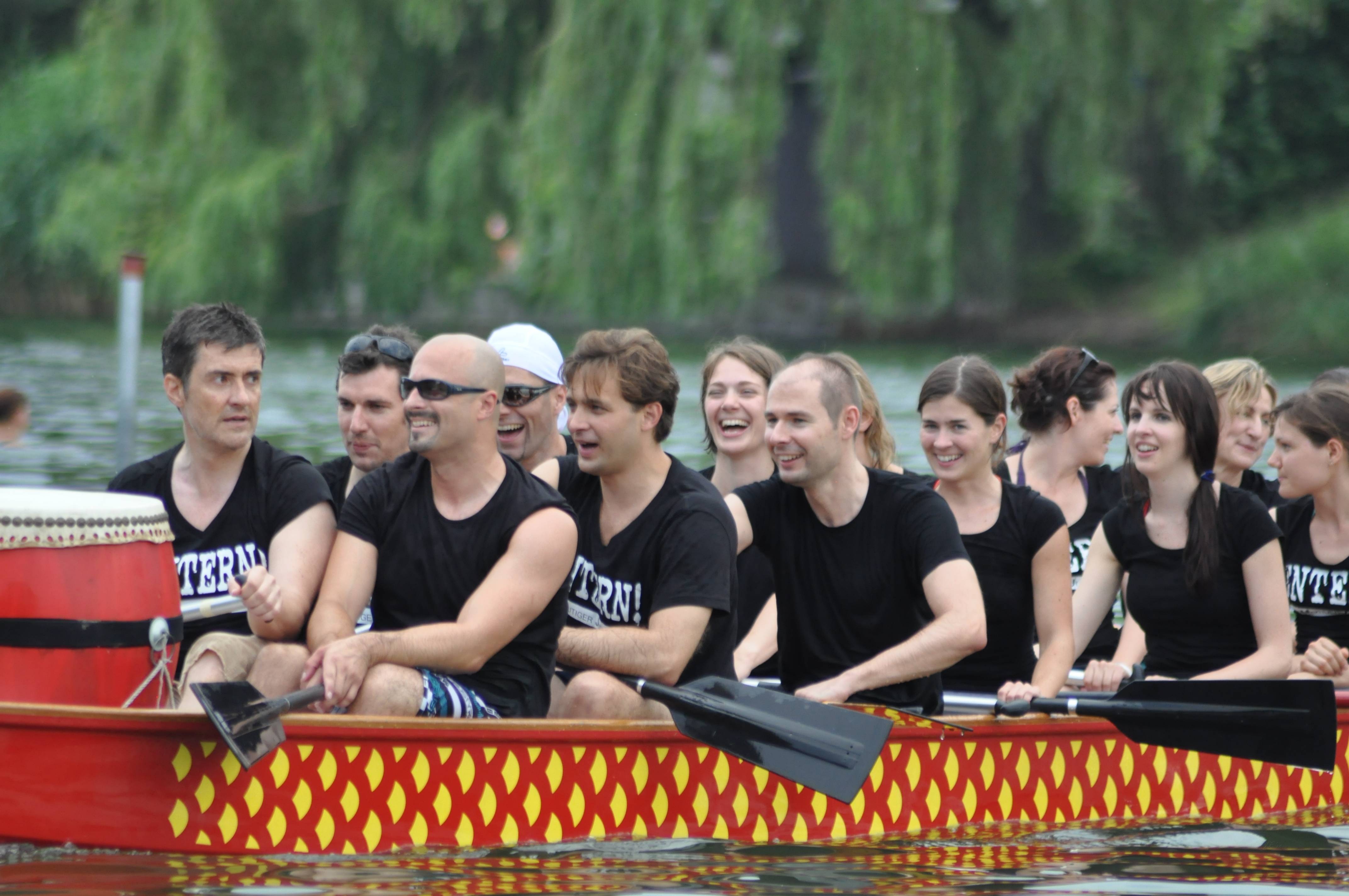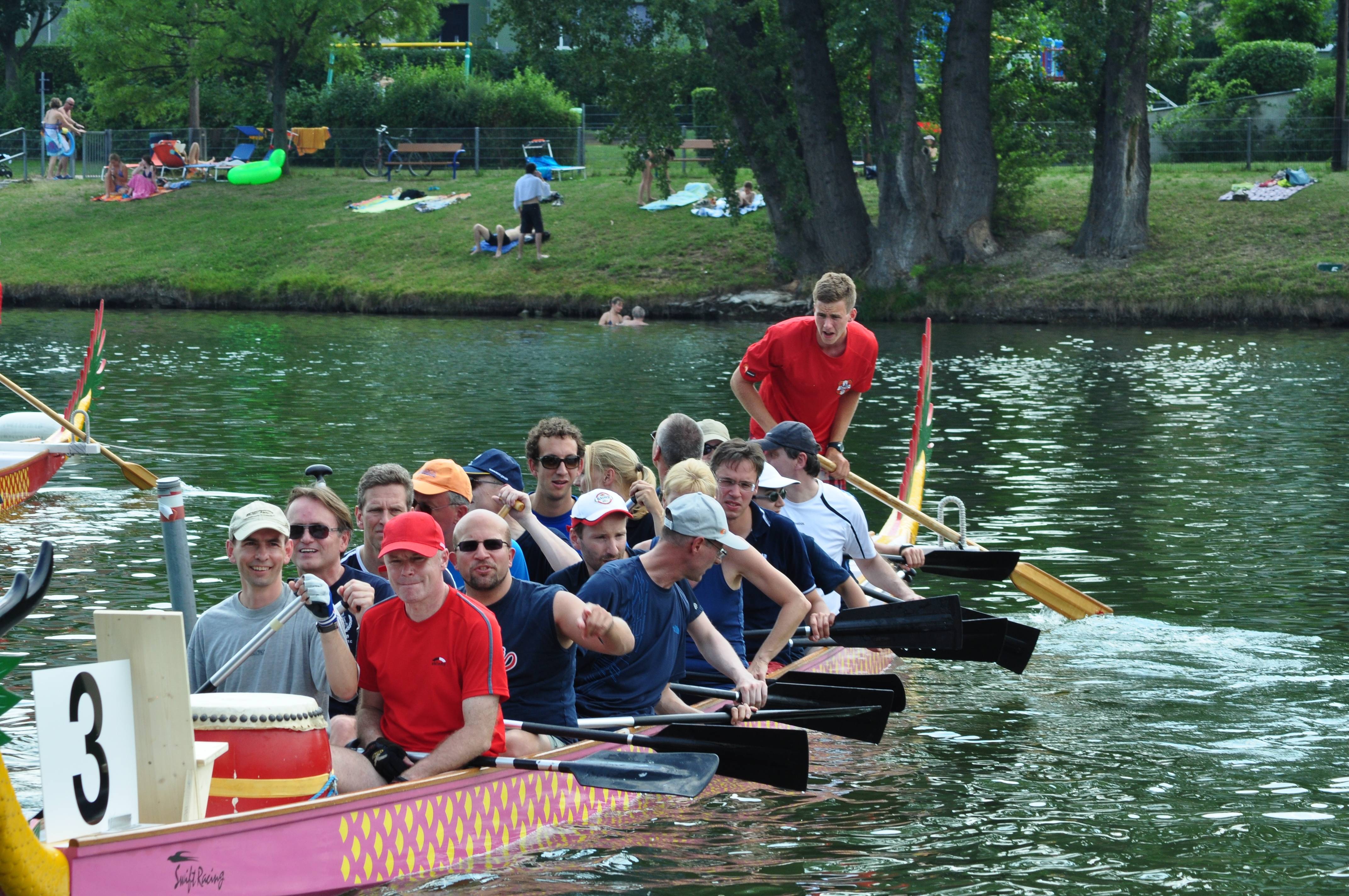 Die Finalisten des Drachenbootrennens am 20. Juni 2012 standen nach 9 Qualifikationsläufen fest. Den ersten Platz erreichte das Boot mit den Richterinnen und Richtern des Verwaltungsgerichtshofs. Sie nützten die Chance des „Hoffnungslaufs“, um sich für das Finale zu qualifizieren, bei dem vier Boote starteten, und waren dann als erste im Ziel – dicht gefolgt vom Boot der „Taktlosen“, besetzt mit Richterinnen und Richtern des Oberlandesgerichts Wien und des Landesgerichts für Strafsachen Wien! Sie hielten den Takt bis zum Schluss durch und hängten das Boot „Oberster Gerichtshof / Generalprokuratur / Evidenzbüro“ (4. Platz) sowie die Anwaltskanzlei Kraft & Winternitz (Vorjahressieger, heuer 3. Platz) ab.  Das Siegerboot - VwGH Am Rennen nahmen 18 Mannschaften teil; vertreten waren nicht nur jede Menge Justizboote (inkl. Bundesministerium für Justiz und Staatsanwaltschaft Wien) und ein Boot des Asylgerichtshofs, sondern auch einige Anwaltskanzleien und ein Boot voller Notare.  Im Finale: ein Kampf um jeden Wassertropfen  Glückliche „Silberne“ Im ersten Durchgang traten alle Mannschaften in Vierergruppen an, wobei es auf die erreichte Zeit ankam. Die drei Schnellsten (Kraft & Winternitz; OGH/Generalprokuratur/Evidenzbüro; OLG/LGSt) waren für das Finale qualifiziert. Die verbleibenden 16 Teams kämpften in der Zwischenrunde um den vierten Finalistenplatz, den sich der VwGH äußerst knapp vor dem Boot des BMJ sicherte. Im Finale hatten die Kolleginnen und Kollegen vom VwGH noch ausreichend Reserven, um einen unangefochtenen Sieg davonzupaddeln (was bewundernd – wenn auch widerwillig – anerkannt werden muss ...). Professionell organisiert hat das Rennen die Polizeisportvereinigung Wien, die nicht nur die Boote bereitstellte, sondern auch die Rennleitung übernahm und die Zeitnehmung mit einer Zielkamera jedem Zweifel entzog – vielen Dank!  Hochspannung unter den Zuschauern Besonderer Dank gilt auch der GÖD für das Sponsoring sowie der Sektion Wien der Vereinigung der österreichischen Richterinnen und Richter, die dieses sportliche Großereignis (knapp 400 Athletinnen und Athleten!) und das nachfolgende Sommerfest organisierte – vor allem in Person von Martina Erlebach und Sabine Matejka!