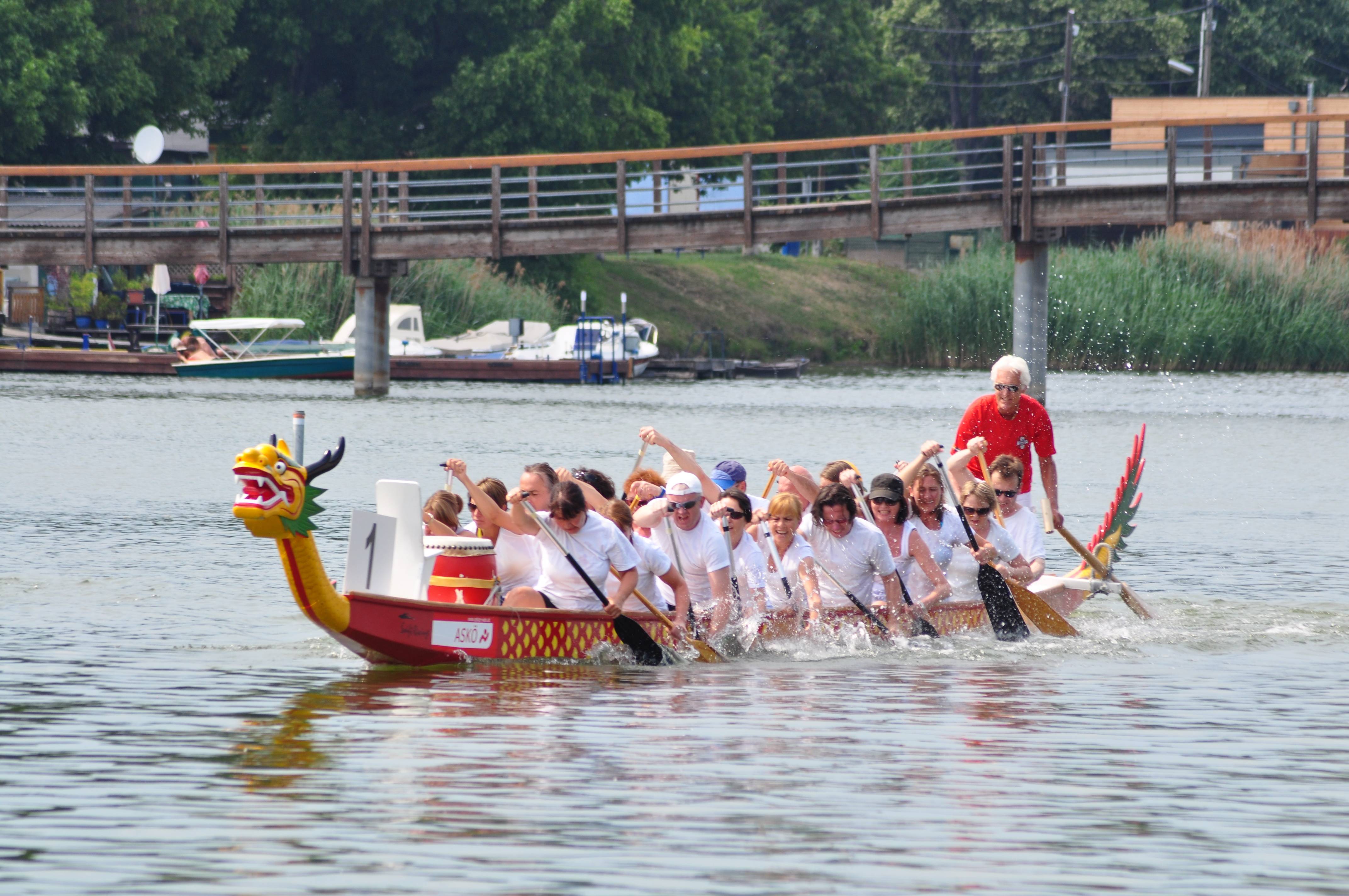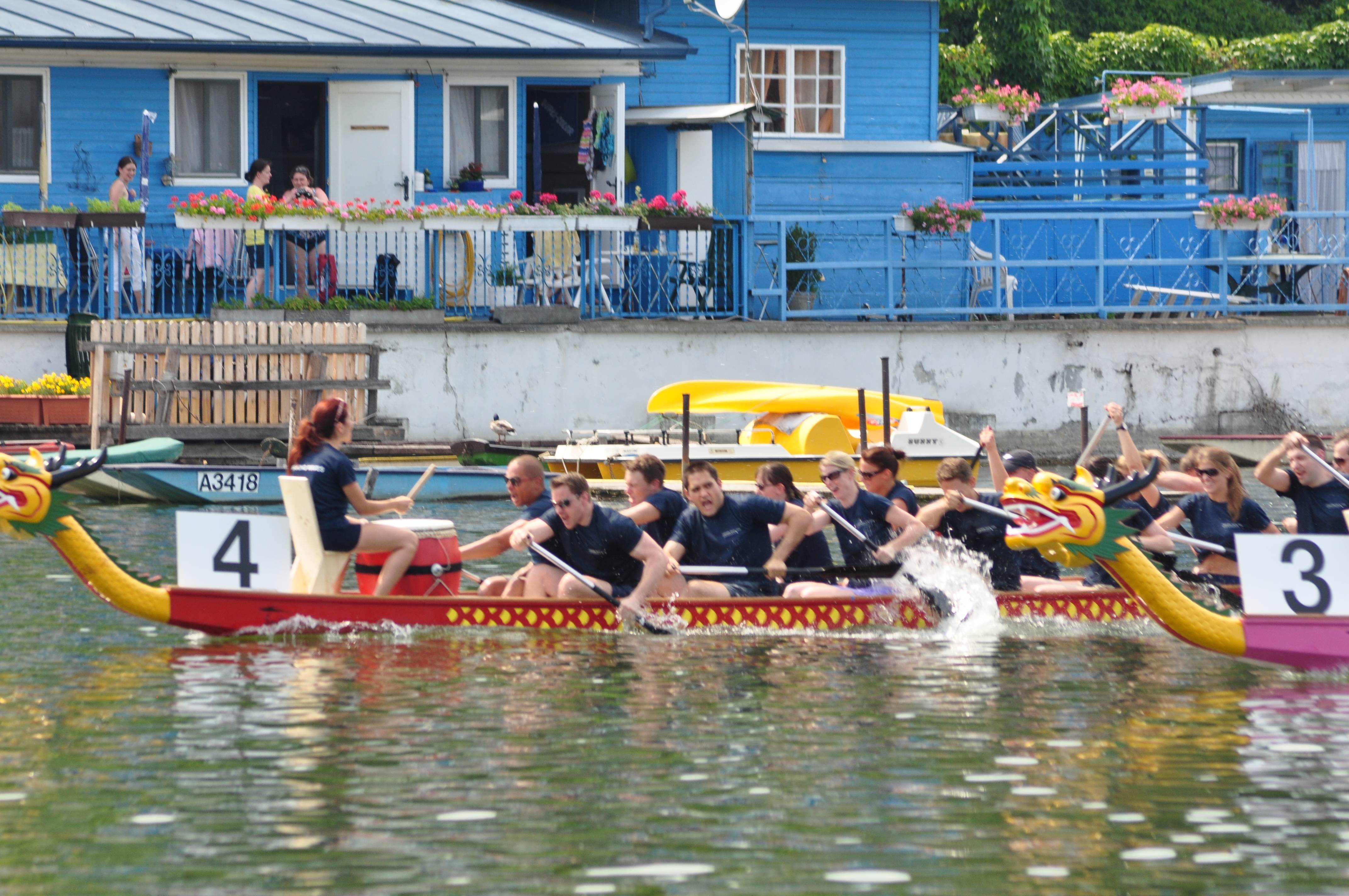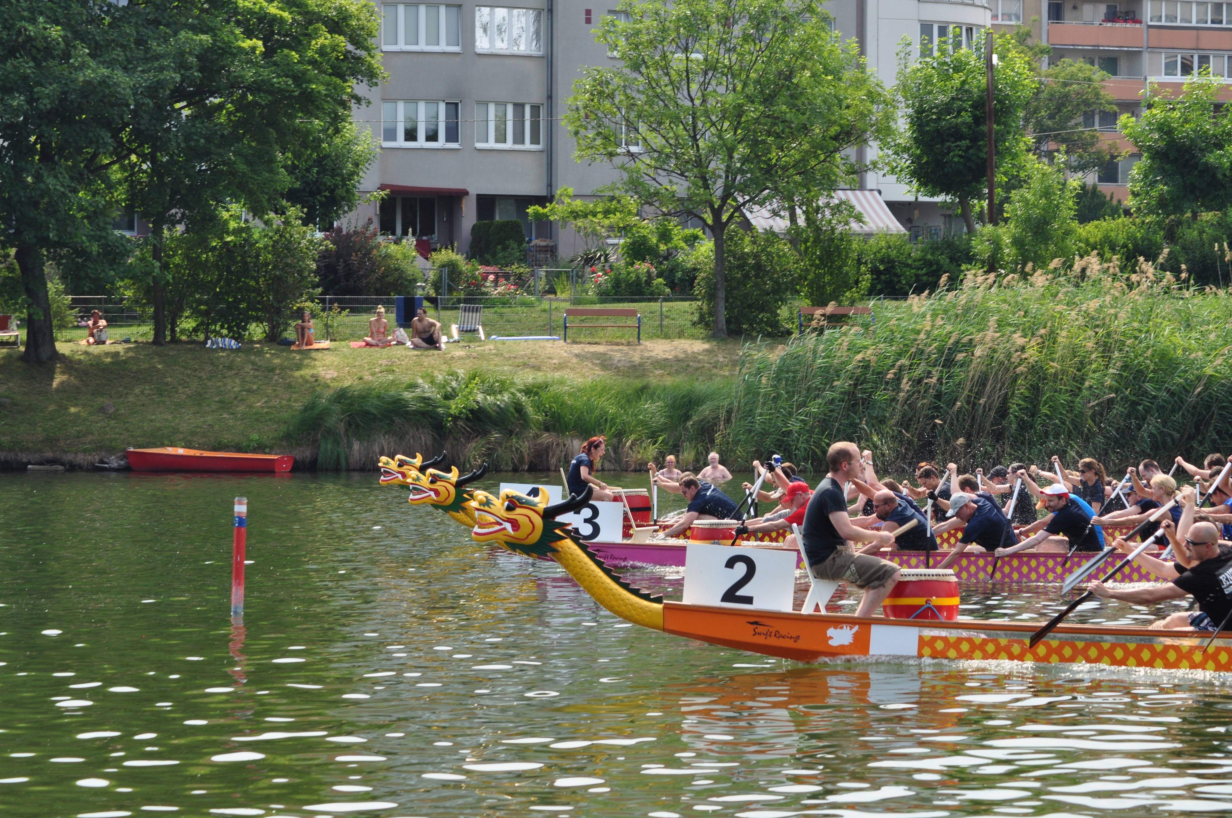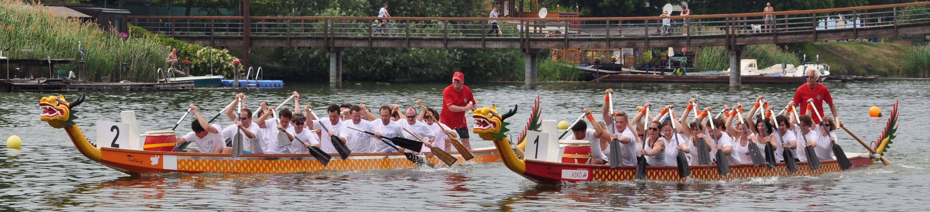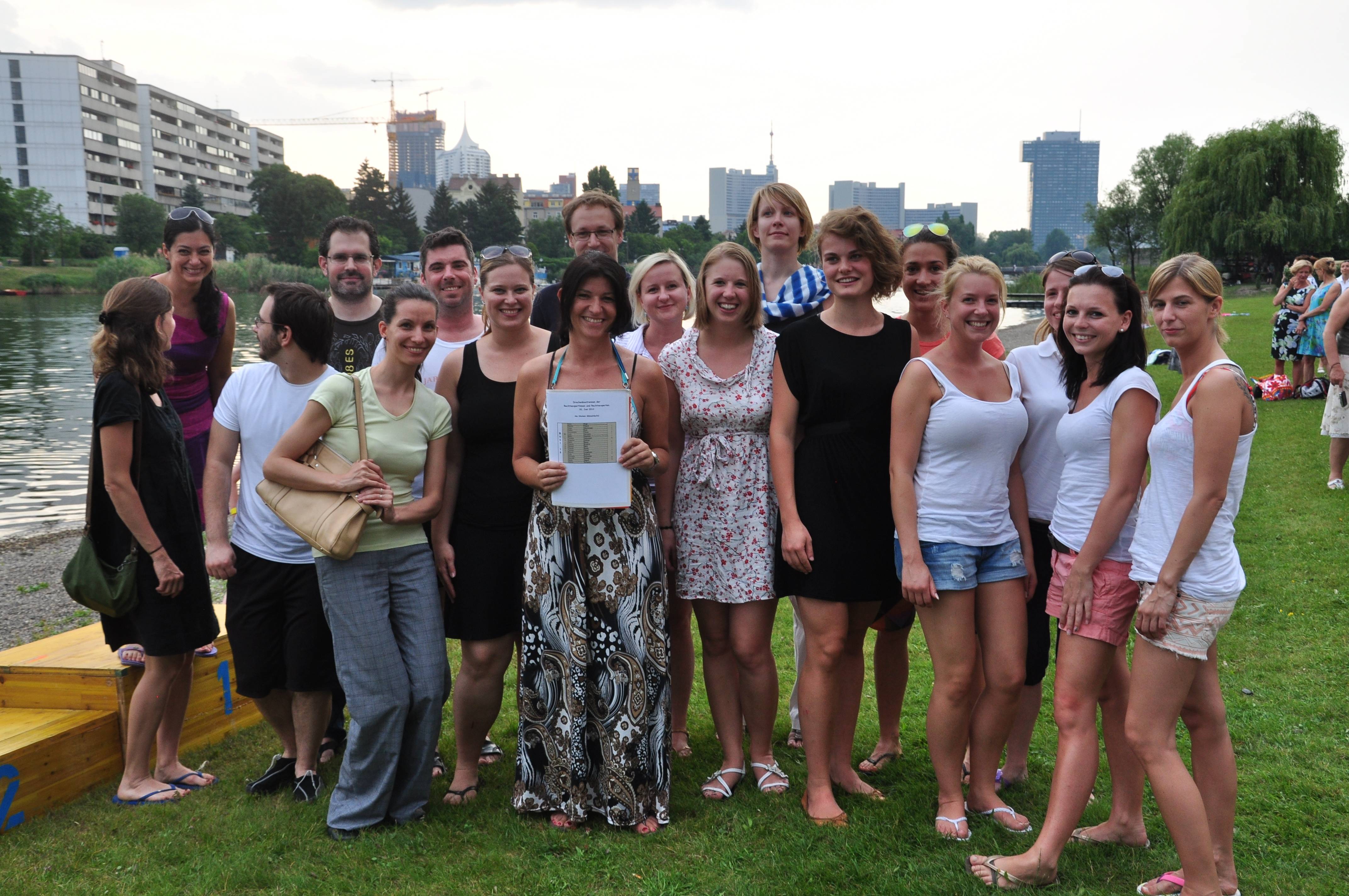 Die Finalisten des Drachenbootrennens am 20. Juni 2012 standen nach 9 Qualifikationsläufen fest. Den ersten Platz erreichte das Boot mit den Richterinnen und Richtern des Verwaltungsgerichtshofs. Sie nützten die Chance des „Hoffnungslaufs“, um sich für das Finale zu qualifizieren, bei dem vier Boote starteten, und waren dann als erste im Ziel – dicht gefolgt vom Boot der „Taktlosen“, besetzt mit Richterinnen und Richtern des Oberlandesgerichts Wien und des Landesgerichts für Strafsachen Wien! Sie hielten den Takt bis zum Schluss durch und hängten das Boot „Oberster Gerichtshof / Generalprokuratur / Evidenzbüro“ (4. Platz) sowie die Anwaltskanzlei Kraft & Winternitz (Vorjahressieger, heuer 3. Platz) ab.  Das Siegerboot - VwGH Am Rennen nahmen 18 Mannschaften teil; vertreten waren nicht nur jede Menge Justizboote (inkl. Bundesministerium für Justiz und Staatsanwaltschaft Wien) und ein Boot des Asylgerichtshofs, sondern auch einige Anwaltskanzleien und ein Boot voller Notare.  Im Finale: ein Kampf um jeden Wassertropfen  Glückliche „Silberne“ Im ersten Durchgang traten alle Mannschaften in Vierergruppen an, wobei es auf die erreichte Zeit ankam. Die drei Schnellsten (Kraft & Winternitz; OGH/Generalprokuratur/Evidenzbüro; OLG/LGSt) waren für das Finale qualifiziert. Die verbleibenden 16 Teams kämpften in der Zwischenrunde um den vierten Finalistenplatz, den sich der VwGH äußerst knapp vor dem Boot des BMJ sicherte. Im Finale hatten die Kolleginnen und Kollegen vom VwGH noch ausreichend Reserven, um einen unangefochtenen Sieg davonzupaddeln (was bewundernd – wenn auch widerwillig – anerkannt werden muss ...). Professionell organisiert hat das Rennen die Polizeisportvereinigung Wien, die nicht nur die Boote bereitstellte, sondern auch die Rennleitung übernahm und die Zeitnehmung mit einer Zielkamera jedem Zweifel entzog – vielen Dank!  Hochspannung unter den Zuschauern Besonderer Dank gilt auch der GÖD für das Sponsoring sowie der Sektion Wien der Vereinigung der österreichischen Richterinnen und Richter, die dieses sportliche Großereignis (knapp 400 Athletinnen und Athleten!) und das nachfolgende Sommerfest organisierte – vor allem in Person von Martina Erlebach und Sabine Matejka!