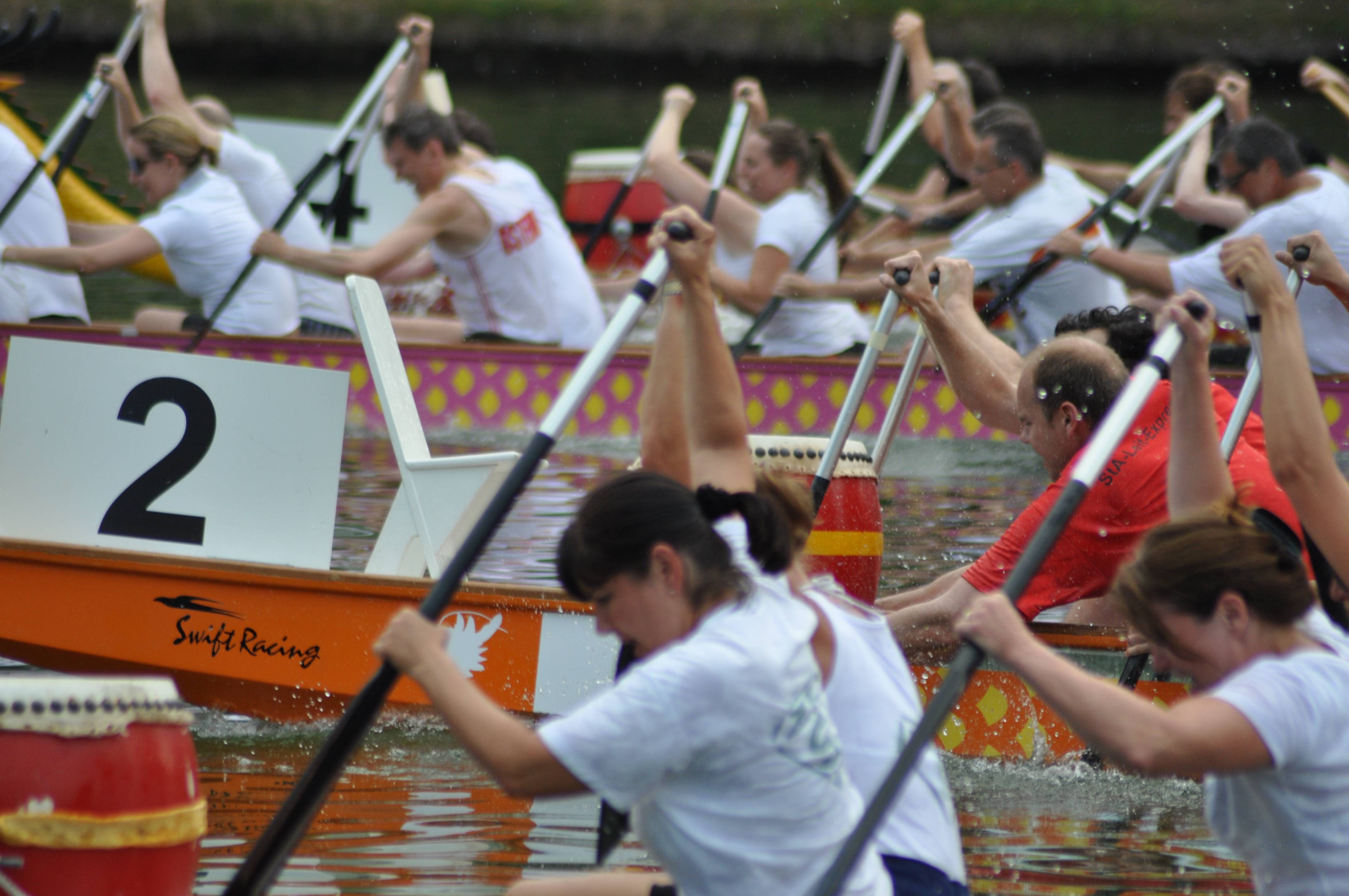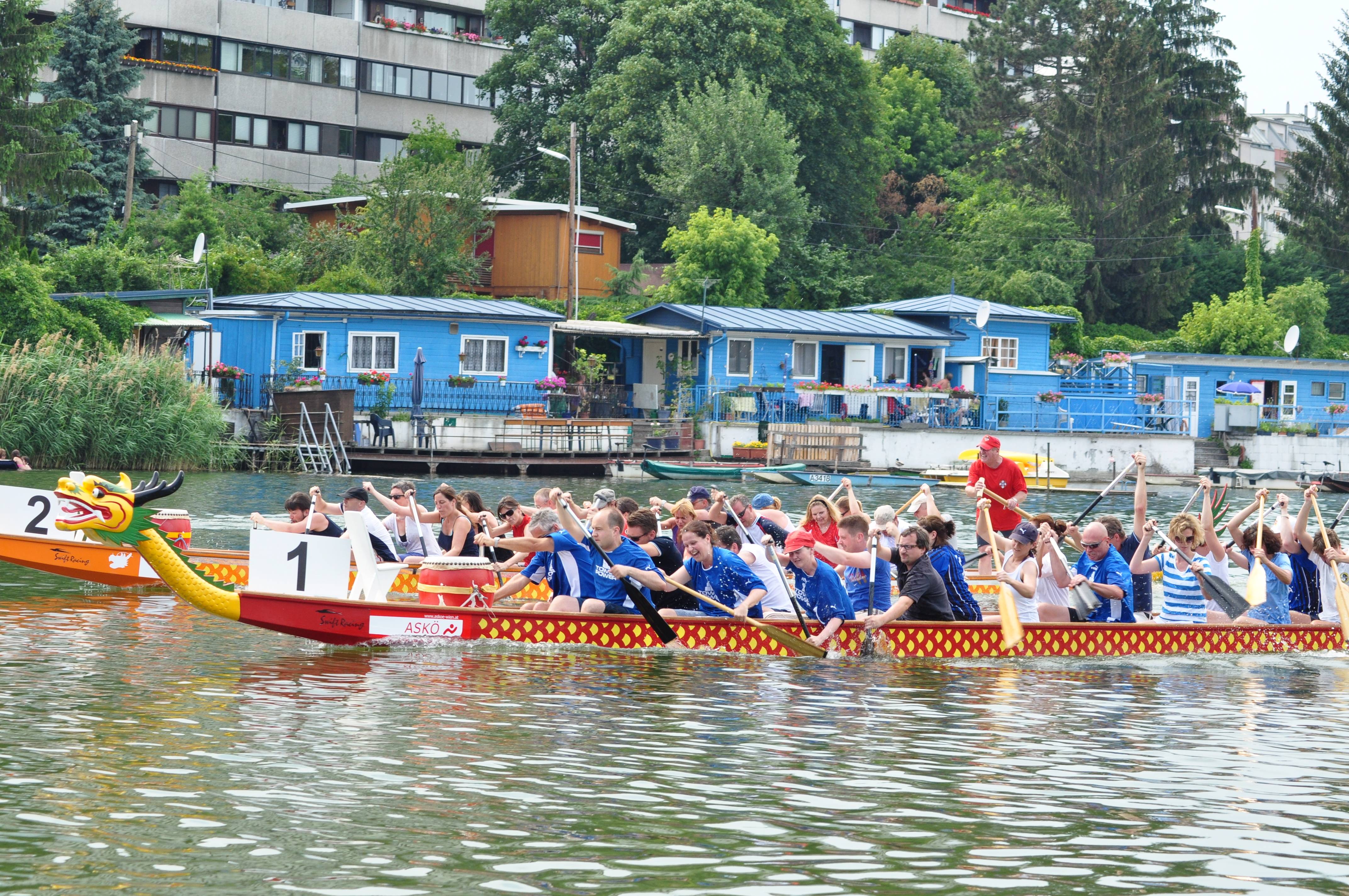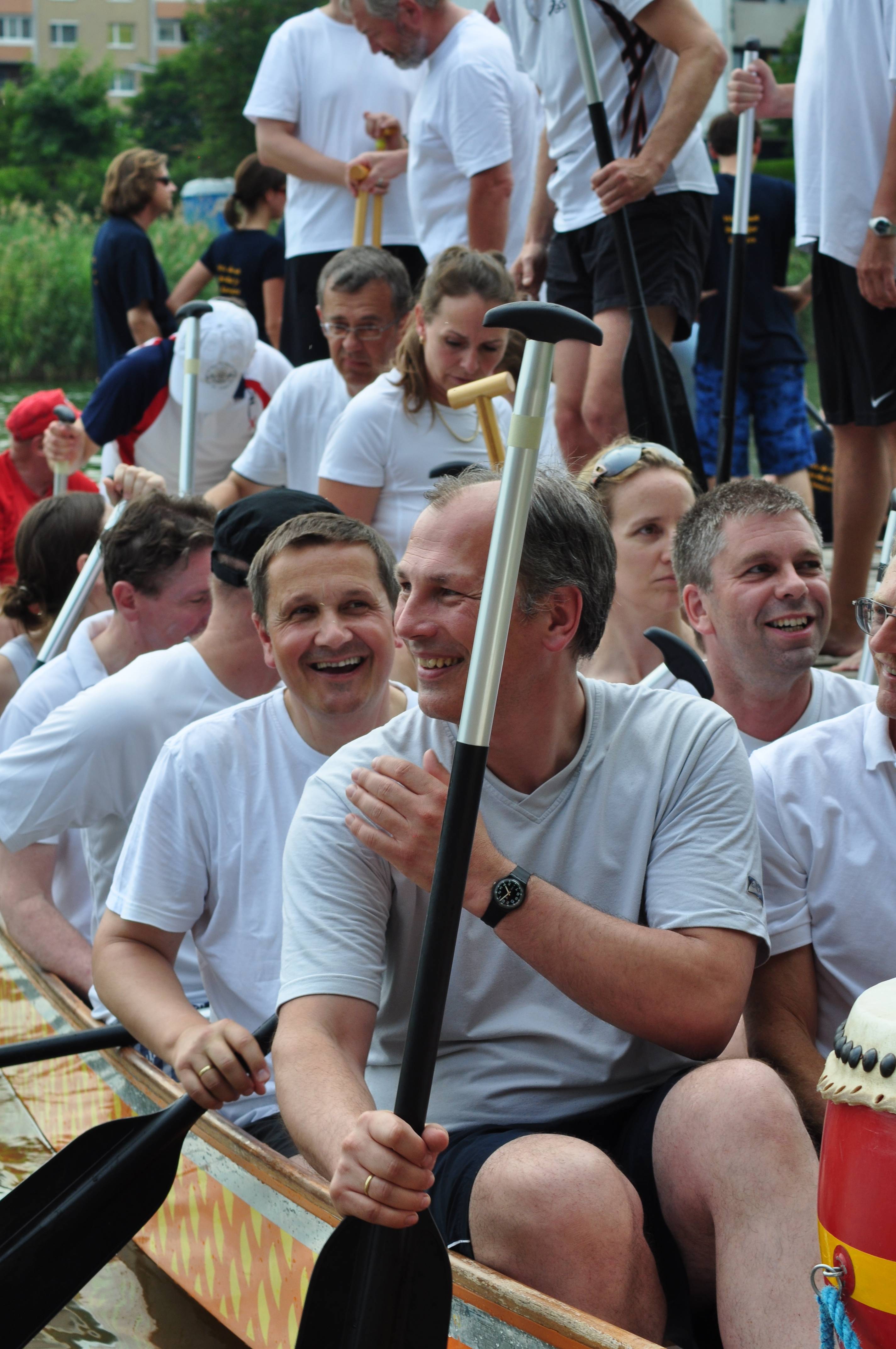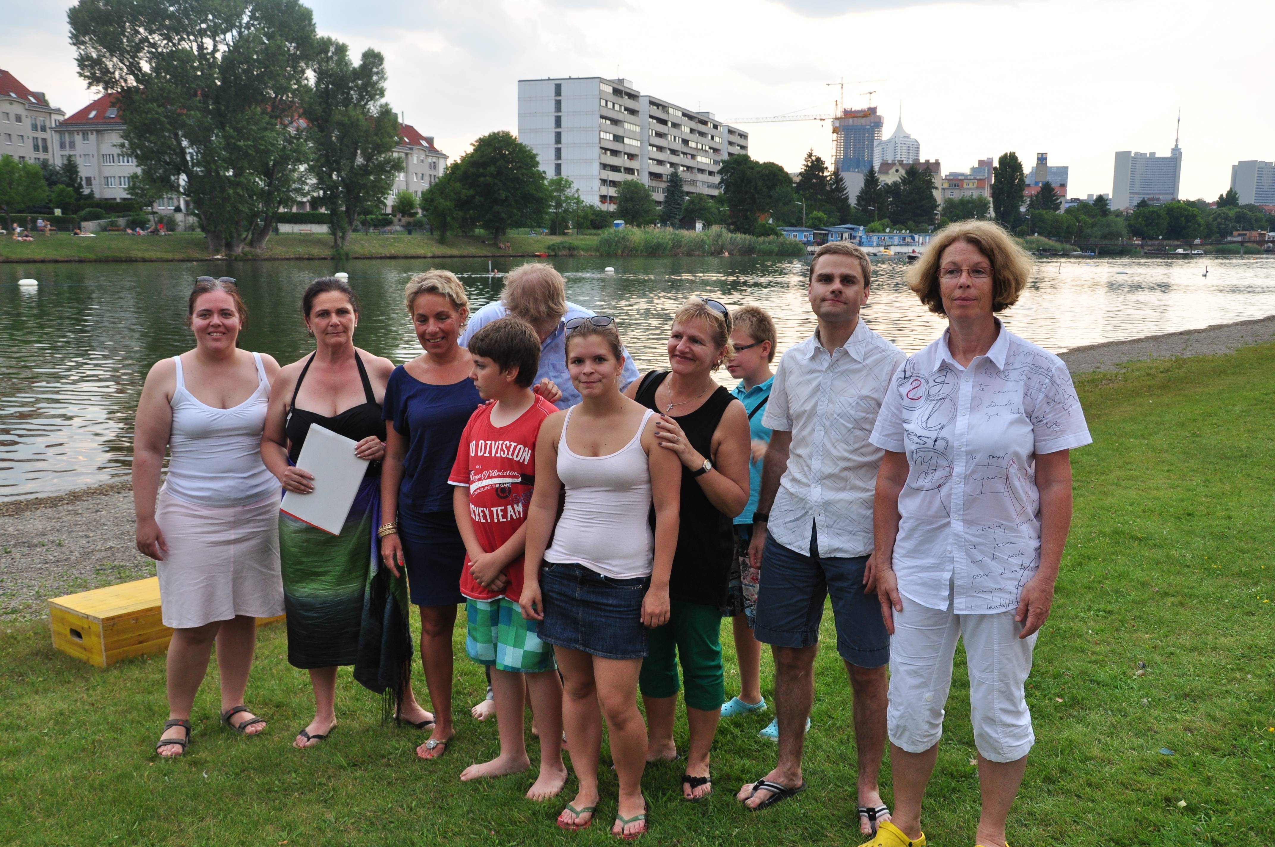 Die Finalisten des Drachenbootrennens am 20. Juni 2012 standen nach 9 Qualifikationsläufen fest. Den ersten Platz erreichte das Boot mit den Richterinnen und Richtern des Verwaltungsgerichtshofs. Sie nützten die Chance des „Hoffnungslaufs“, um sich für das Finale zu qualifizieren, bei dem vier Boote starteten, und waren dann als erste im Ziel – dicht gefolgt vom Boot der „Taktlosen“, besetzt mit Richterinnen und Richtern des Oberlandesgerichts Wien und des Landesgerichts für Strafsachen Wien! Sie hielten den Takt bis zum Schluss durch und hängten das Boot „Oberster Gerichtshof / Generalprokuratur / Evidenzbüro“ (4. Platz) sowie die Anwaltskanzlei Kraft & Winternitz (Vorjahressieger, heuer 3. Platz) ab.  Das Siegerboot - VwGH Am Rennen nahmen 18 Mannschaften teil; vertreten waren nicht nur jede Menge Justizboote (inkl. Bundesministerium für Justiz und Staatsanwaltschaft Wien) und ein Boot des Asylgerichtshofs, sondern auch einige Anwaltskanzleien und ein Boot voller Notare.  Im Finale: ein Kampf um jeden Wassertropfen  Glückliche „Silberne“ Im ersten Durchgang traten alle Mannschaften in Vierergruppen an, wobei es auf die erreichte Zeit ankam. Die drei Schnellsten (Kraft & Winternitz; OGH/Generalprokuratur/Evidenzbüro; OLG/LGSt) waren für das Finale qualifiziert. Die verbleibenden 16 Teams kämpften in der Zwischenrunde um den vierten Finalistenplatz, den sich der VwGH äußerst knapp vor dem Boot des BMJ sicherte. Im Finale hatten die Kolleginnen und Kollegen vom VwGH noch ausreichend Reserven, um einen unangefochtenen Sieg davonzupaddeln (was bewundernd – wenn auch widerwillig – anerkannt werden muss ...). Professionell organisiert hat das Rennen die Polizeisportvereinigung Wien, die nicht nur die Boote bereitstellte, sondern auch die Rennleitung übernahm und die Zeitnehmung mit einer Zielkamera jedem Zweifel entzog – vielen Dank!  Hochspannung unter den Zuschauern Besonderer Dank gilt auch der GÖD für das Sponsoring sowie der Sektion Wien der Vereinigung der österreichischen Richterinnen und Richter, die dieses sportliche Großereignis (knapp 400 Athletinnen und Athleten!) und das nachfolgende Sommerfest organisierte – vor allem in Person von Martina Erlebach und Sabine Matejka!