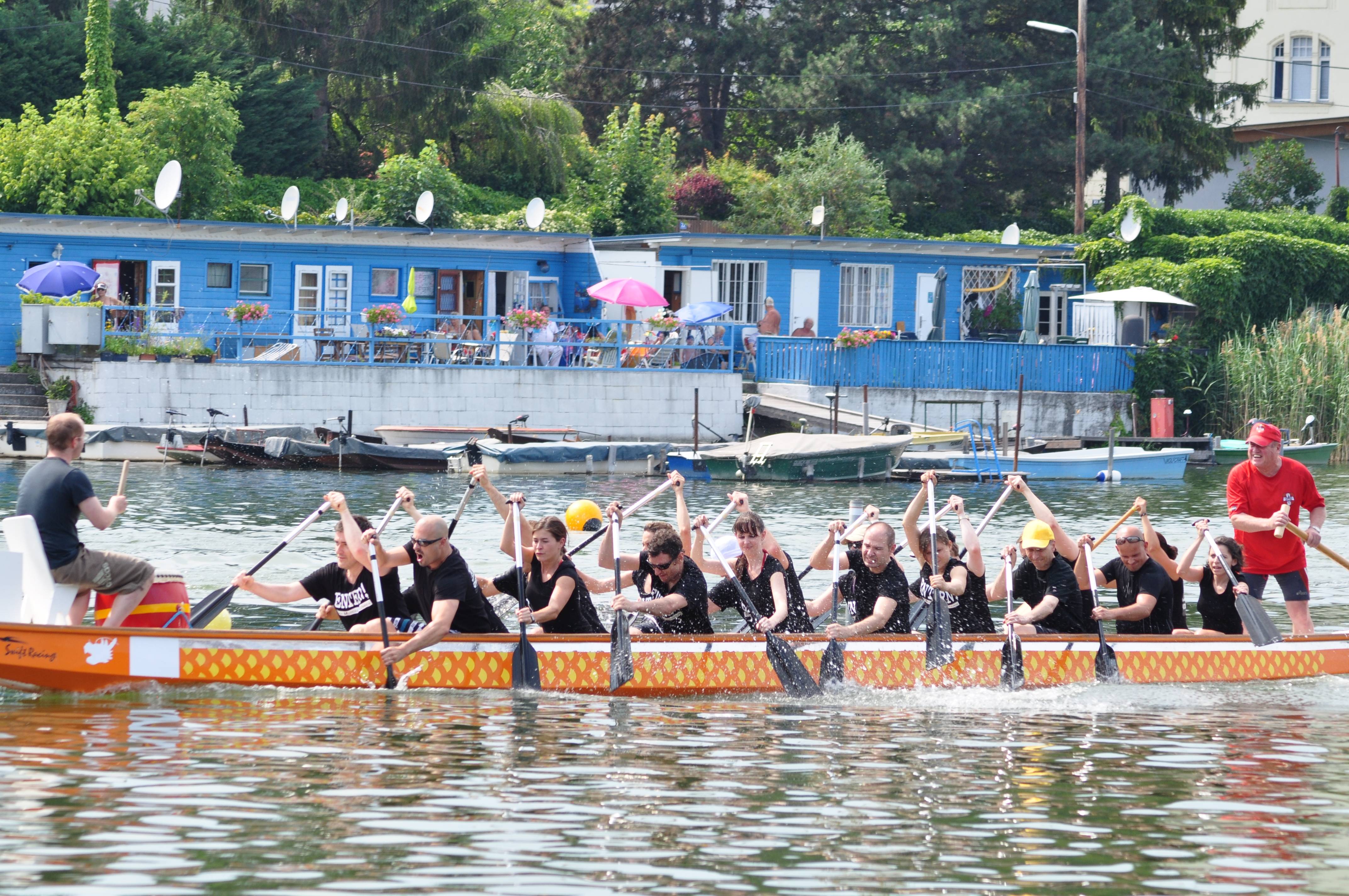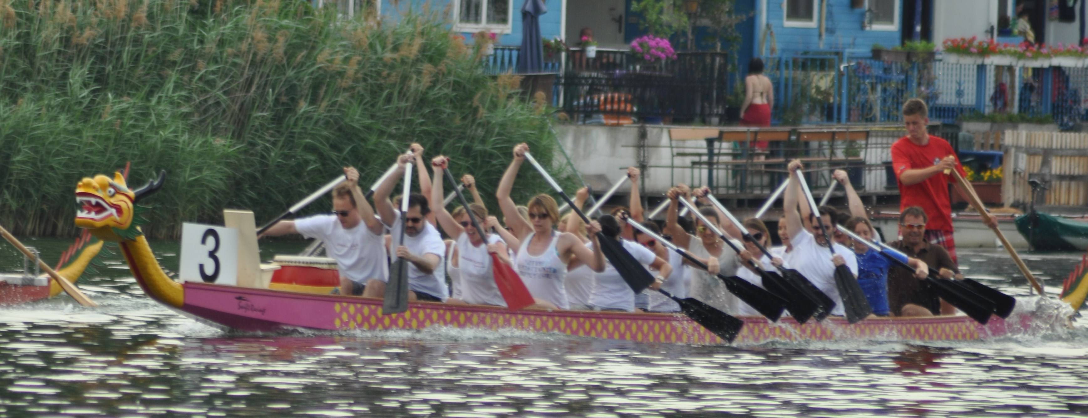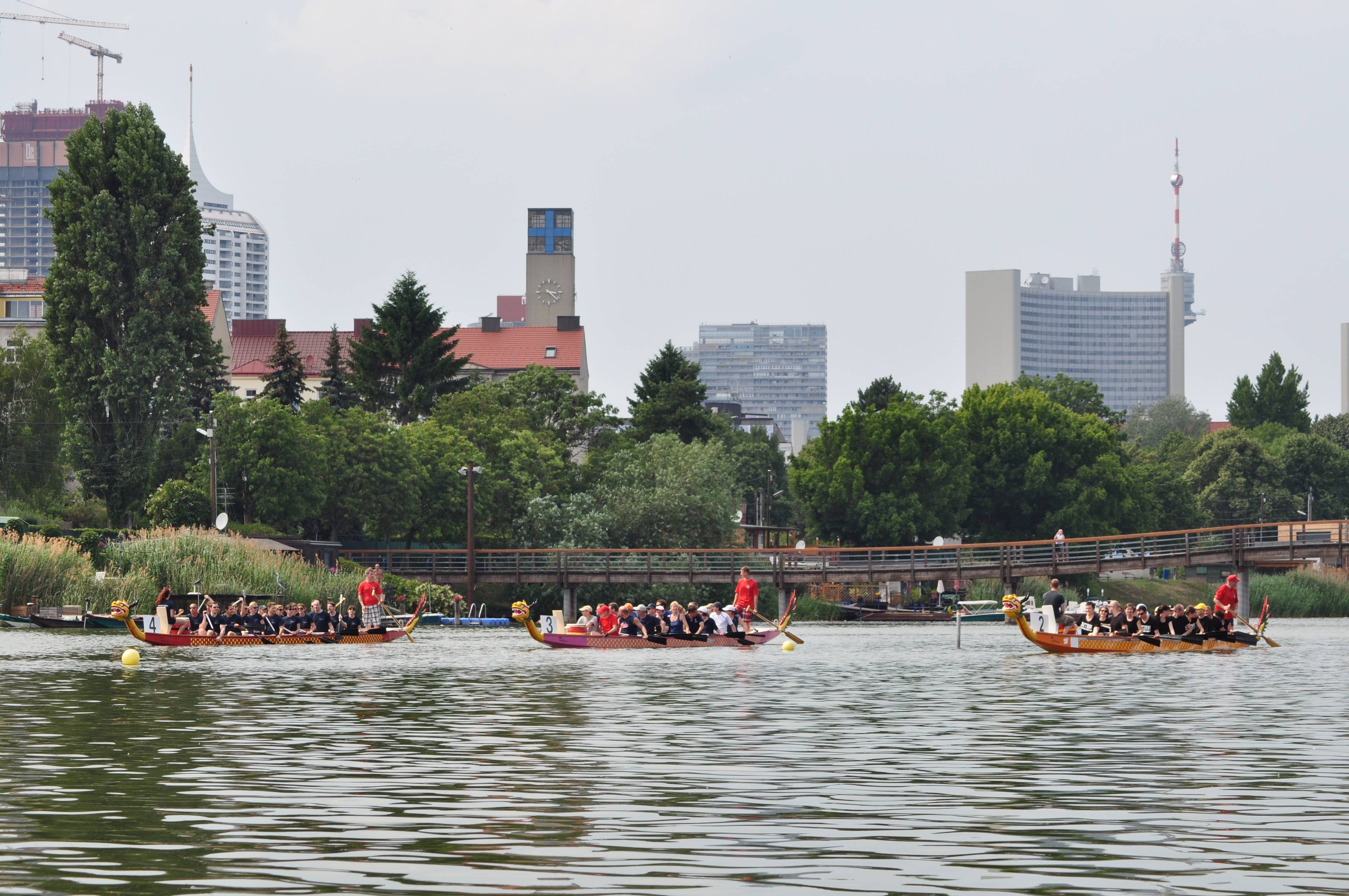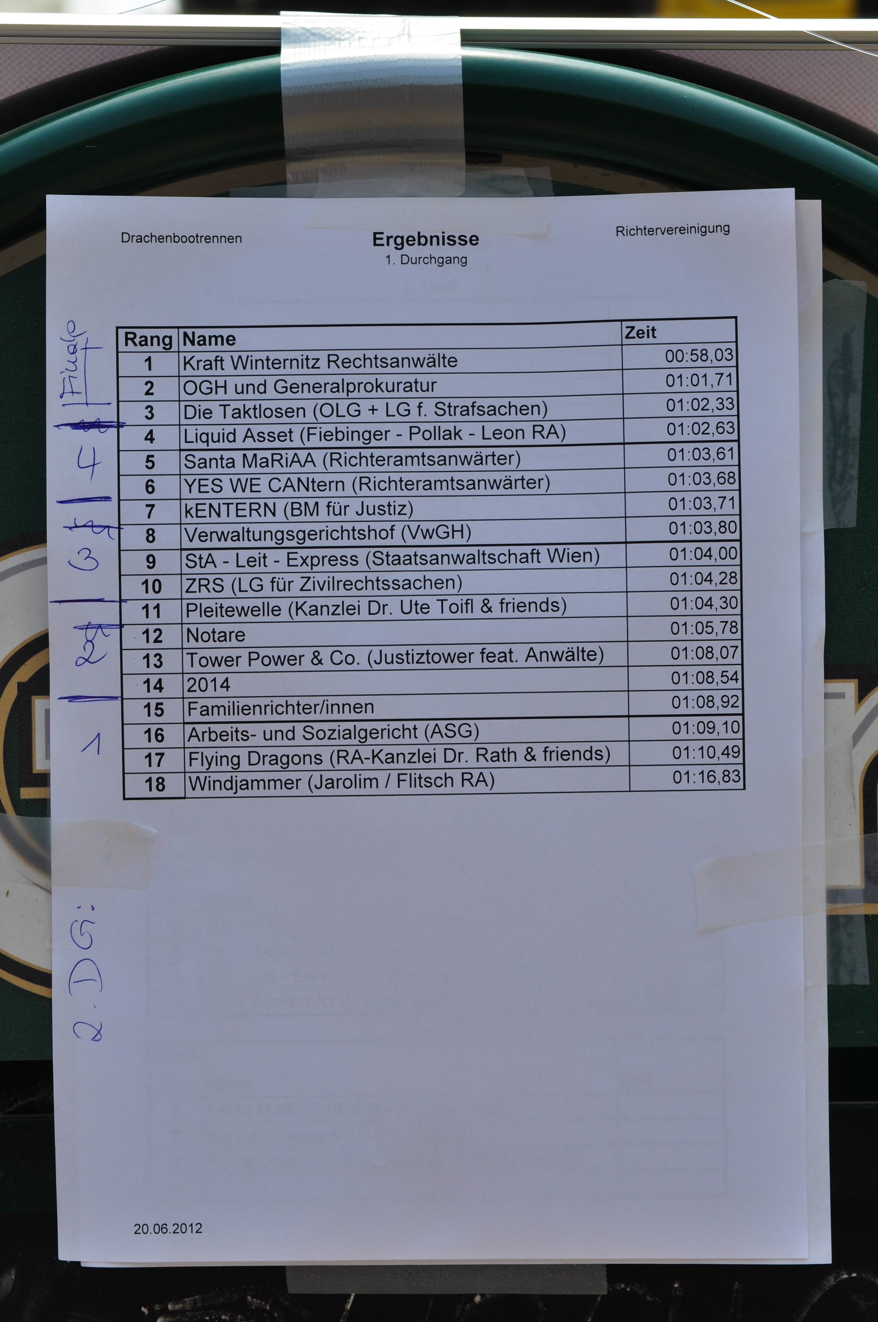 Die Finalisten des Drachenbootrennens am 20. Juni 2012 standen nach 9 Qualifikationsläufen fest. Den ersten Platz erreichte das Boot mit den Richterinnen und Richtern des Verwaltungsgerichtshofs. Sie nützten die Chance des „Hoffnungslaufs“, um sich für das Finale zu qualifizieren, bei dem vier Boote starteten, und waren dann als erste im Ziel – dicht gefolgt vom Boot der „Taktlosen“, besetzt mit Richterinnen und Richtern des Oberlandesgerichts Wien und des Landesgerichts für Strafsachen Wien! Sie hielten den Takt bis zum Schluss durch und hängten das Boot „Oberster Gerichtshof / Generalprokuratur / Evidenzbüro“ (4. Platz) sowie die Anwaltskanzlei Kraft & Winternitz (Vorjahressieger, heuer 3. Platz) ab.  Das Siegerboot - VwGH Am Rennen nahmen 18 Mannschaften teil; vertreten waren nicht nur jede Menge Justizboote (inkl. Bundesministerium für Justiz und Staatsanwaltschaft Wien) und ein Boot des Asylgerichtshofs, sondern auch einige Anwaltskanzleien und ein Boot voller Notare.  Im Finale: ein Kampf um jeden Wassertropfen  Glückliche „Silberne“ Im ersten Durchgang traten alle Mannschaften in Vierergruppen an, wobei es auf die erreichte Zeit ankam. Die drei Schnellsten (Kraft & Winternitz; OGH/Generalprokuratur/Evidenzbüro; OLG/LGSt) waren für das Finale qualifiziert. Die verbleibenden 16 Teams kämpften in der Zwischenrunde um den vierten Finalistenplatz, den sich der VwGH äußerst knapp vor dem Boot des BMJ sicherte. Im Finale hatten die Kolleginnen und Kollegen vom VwGH noch ausreichend Reserven, um einen unangefochtenen Sieg davonzupaddeln (was bewundernd – wenn auch widerwillig – anerkannt werden muss ...). Professionell organisiert hat das Rennen die Polizeisportvereinigung Wien, die nicht nur die Boote bereitstellte, sondern auch die Rennleitung übernahm und die Zeitnehmung mit einer Zielkamera jedem Zweifel entzog – vielen Dank!  Hochspannung unter den Zuschauern Besonderer Dank gilt auch der GÖD für das Sponsoring sowie der Sektion Wien der Vereinigung der österreichischen Richterinnen und Richter, die dieses sportliche Großereignis (knapp 400 Athletinnen und Athleten!) und das nachfolgende Sommerfest organisierte – vor allem in Person von Martina Erlebach und Sabine Matejka!