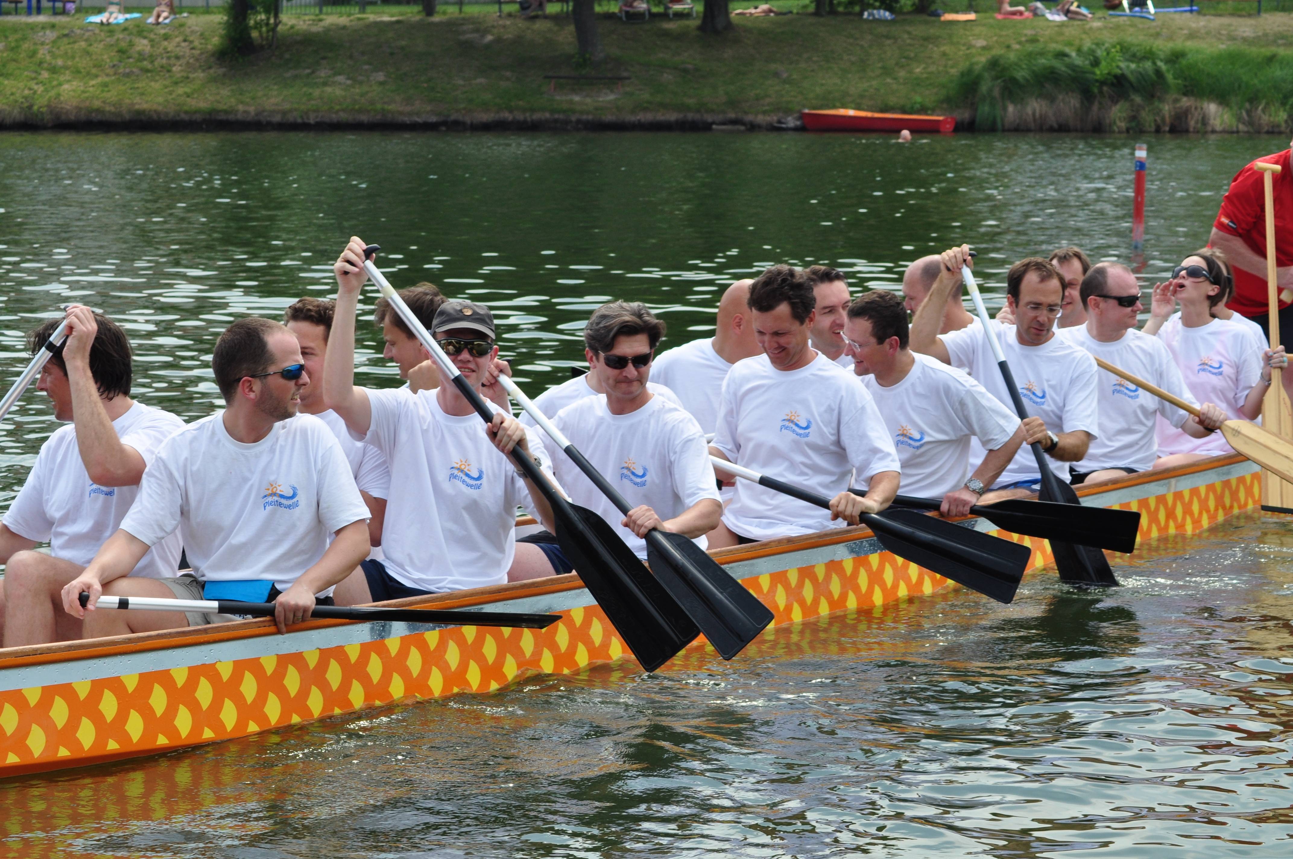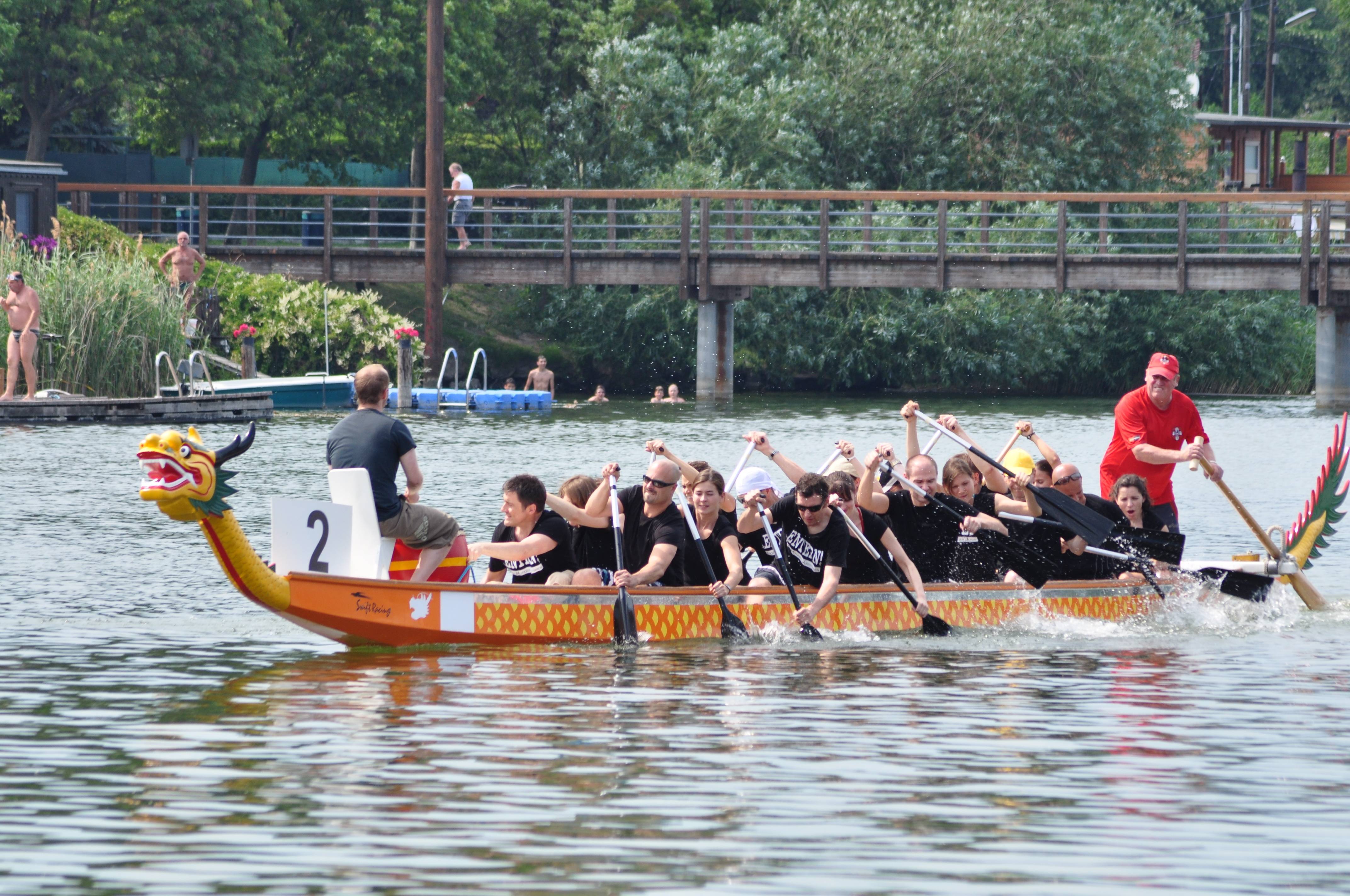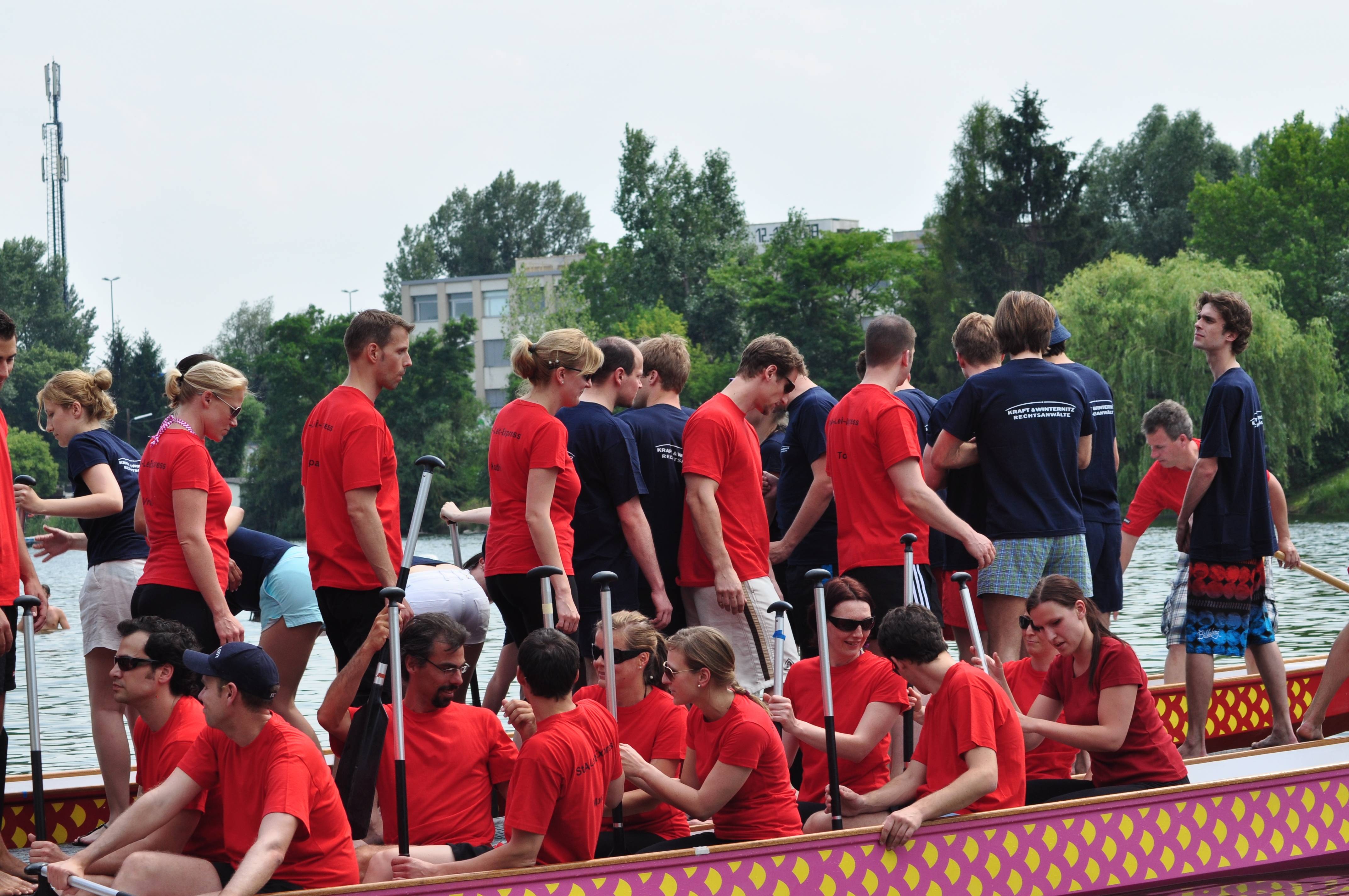 Die Finalisten des Drachenbootrennens am 20. Juni 2012 standen nach 9 Qualifikationsläufen fest. Den ersten Platz erreichte das Boot mit den Richterinnen und Richtern des Verwaltungsgerichtshofs. Sie nützten die Chance des „Hoffnungslaufs“, um sich für das Finale zu qualifizieren, bei dem vier Boote starteten, und waren dann als erste im Ziel – dicht gefolgt vom Boot der „Taktlosen“, besetzt mit Richterinnen und Richtern des Oberlandesgerichts Wien und des Landesgerichts für Strafsachen Wien! Sie hielten den Takt bis zum Schluss durch und hängten das Boot „Oberster Gerichtshof / Generalprokuratur / Evidenzbüro“ (4. Platz) sowie die Anwaltskanzlei Kraft & Winternitz (Vorjahressieger, heuer 3. Platz) ab.  Das Siegerboot - VwGH Am Rennen nahmen 18 Mannschaften teil; vertreten waren nicht nur jede Menge Justizboote (inkl. Bundesministerium für Justiz und Staatsanwaltschaft Wien) und ein Boot des Asylgerichtshofs, sondern auch einige Anwaltskanzleien und ein Boot voller Notare.  Im Finale: ein Kampf um jeden Wassertropfen  Glückliche „Silberne“ Im ersten Durchgang traten alle Mannschaften in Vierergruppen an, wobei es auf die erreichte Zeit ankam. Die drei Schnellsten (Kraft & Winternitz; OGH/Generalprokuratur/Evidenzbüro; OLG/LGSt) waren für das Finale qualifiziert. Die verbleibenden 16 Teams kämpften in der Zwischenrunde um den vierten Finalistenplatz, den sich der VwGH äußerst knapp vor dem Boot des BMJ sicherte. Im Finale hatten die Kolleginnen und Kollegen vom VwGH noch ausreichend Reserven, um einen unangefochtenen Sieg davonzupaddeln (was bewundernd – wenn auch widerwillig – anerkannt werden muss ...). Professionell organisiert hat das Rennen die Polizeisportvereinigung Wien, die nicht nur die Boote bereitstellte, sondern auch die Rennleitung übernahm und die Zeitnehmung mit einer Zielkamera jedem Zweifel entzog – vielen Dank!  Hochspannung unter den Zuschauern Besonderer Dank gilt auch der GÖD für das Sponsoring sowie der Sektion Wien der Vereinigung der österreichischen Richterinnen und Richter, die dieses sportliche Großereignis (knapp 400 Athletinnen und Athleten!) und das nachfolgende Sommerfest organisierte – vor allem in Person von Martina Erlebach und Sabine Matejka!